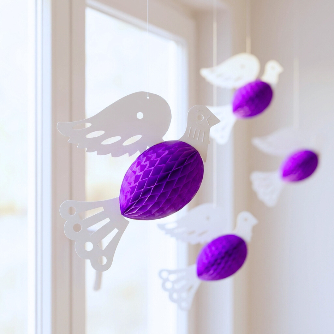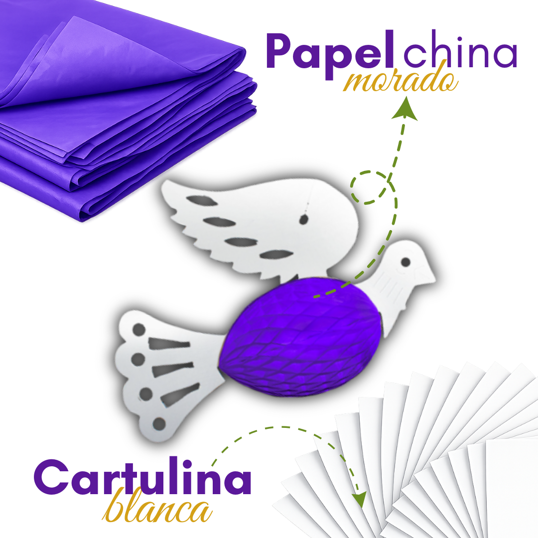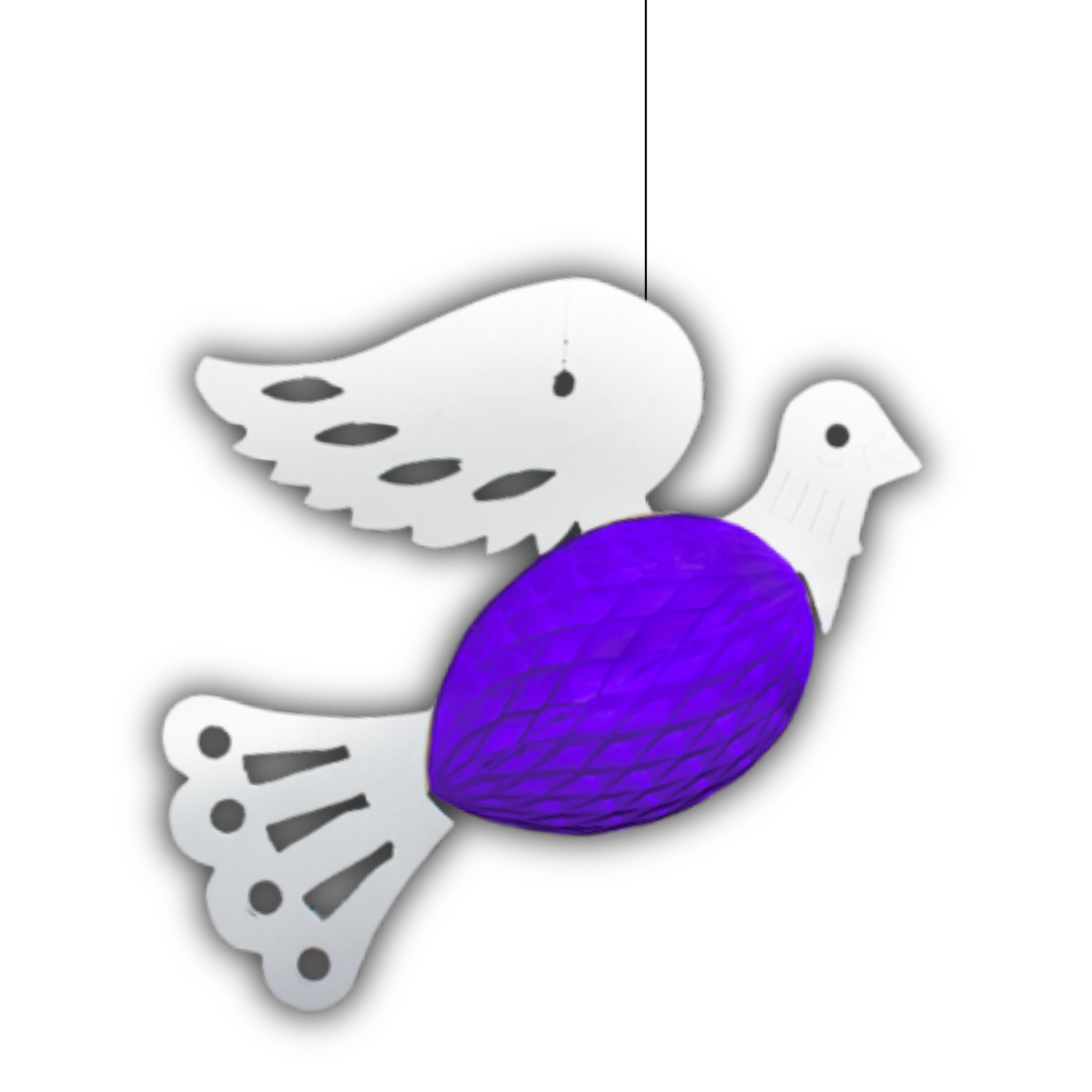 Paloma decorativa colgante con base de cartulina blanca y pancita en papel china morado con técnica nido de abeja. Figura plegable, ligera y fácil de colgar.