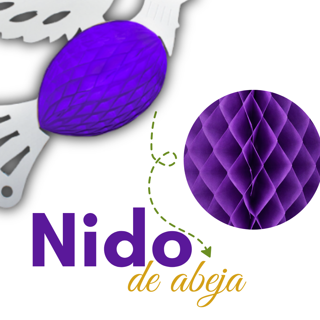 La parte central o “pancita” está hecha con papel china utilizando la técnica nido de abeja en color morado, lo que crea un efecto voluminoso y ligero que destaca al colgarla. Gracias a su diseño plegable, es fácil de guardar y transportar sin perder su forma.