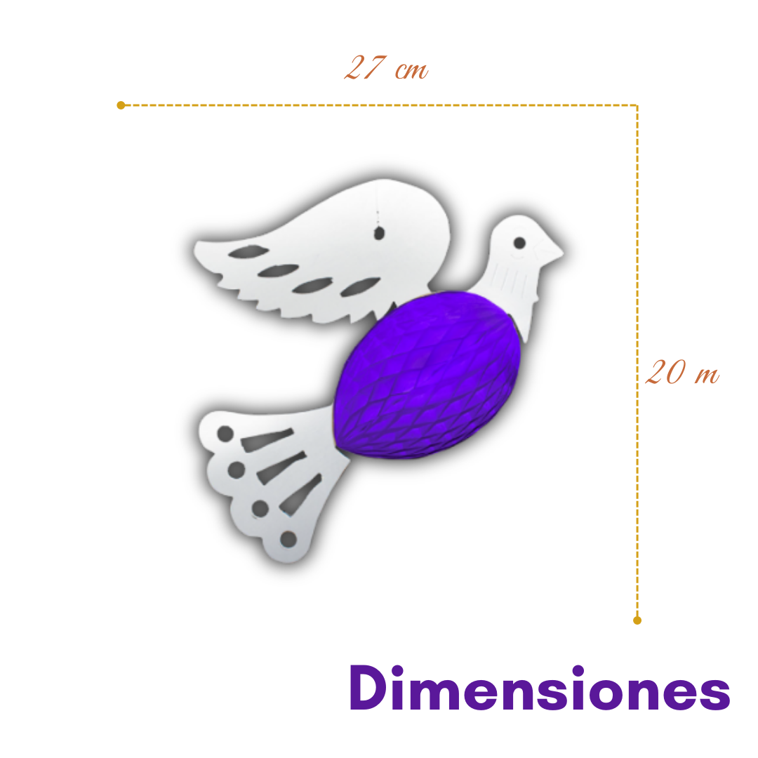 Su buen tamaño permite que luzca muy bien en espacios decorativos, entradas, fondos de fotos o montajes temáticos. La paloma decorativa es ideal para ambientaciones de temporada, eventos especiales o decoraciones donde se busque una figura colgante ligera y vistosa.