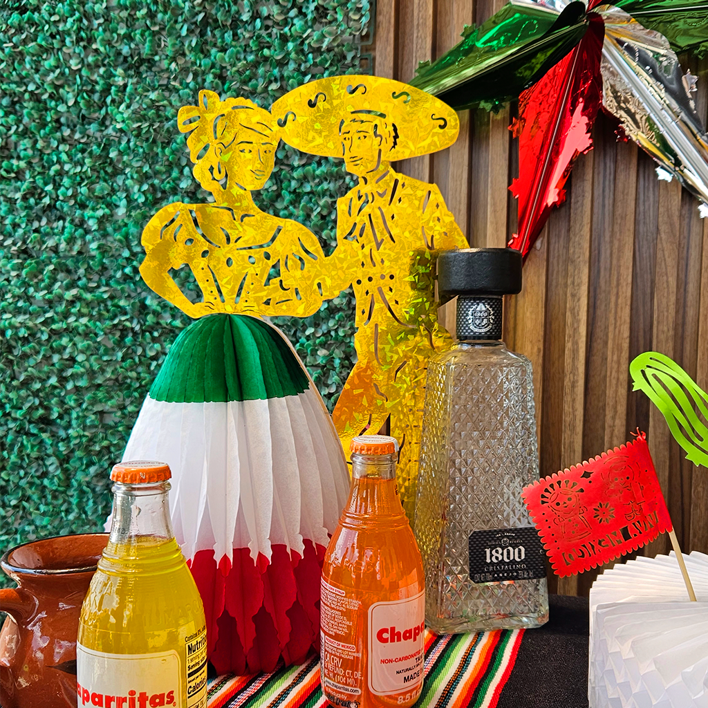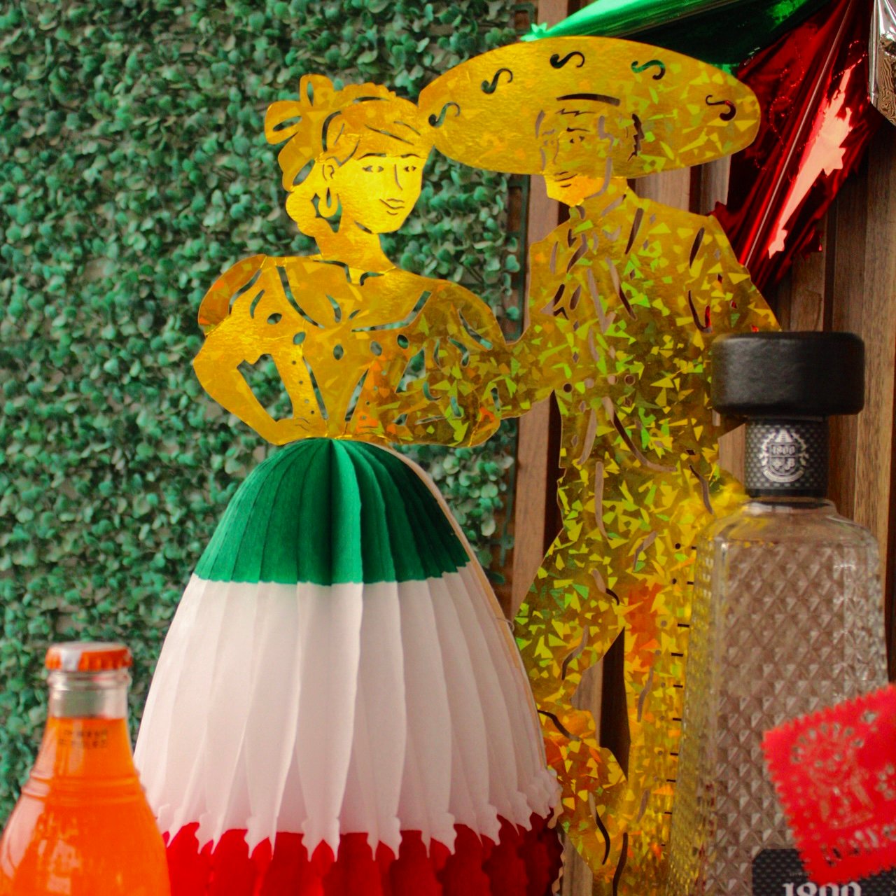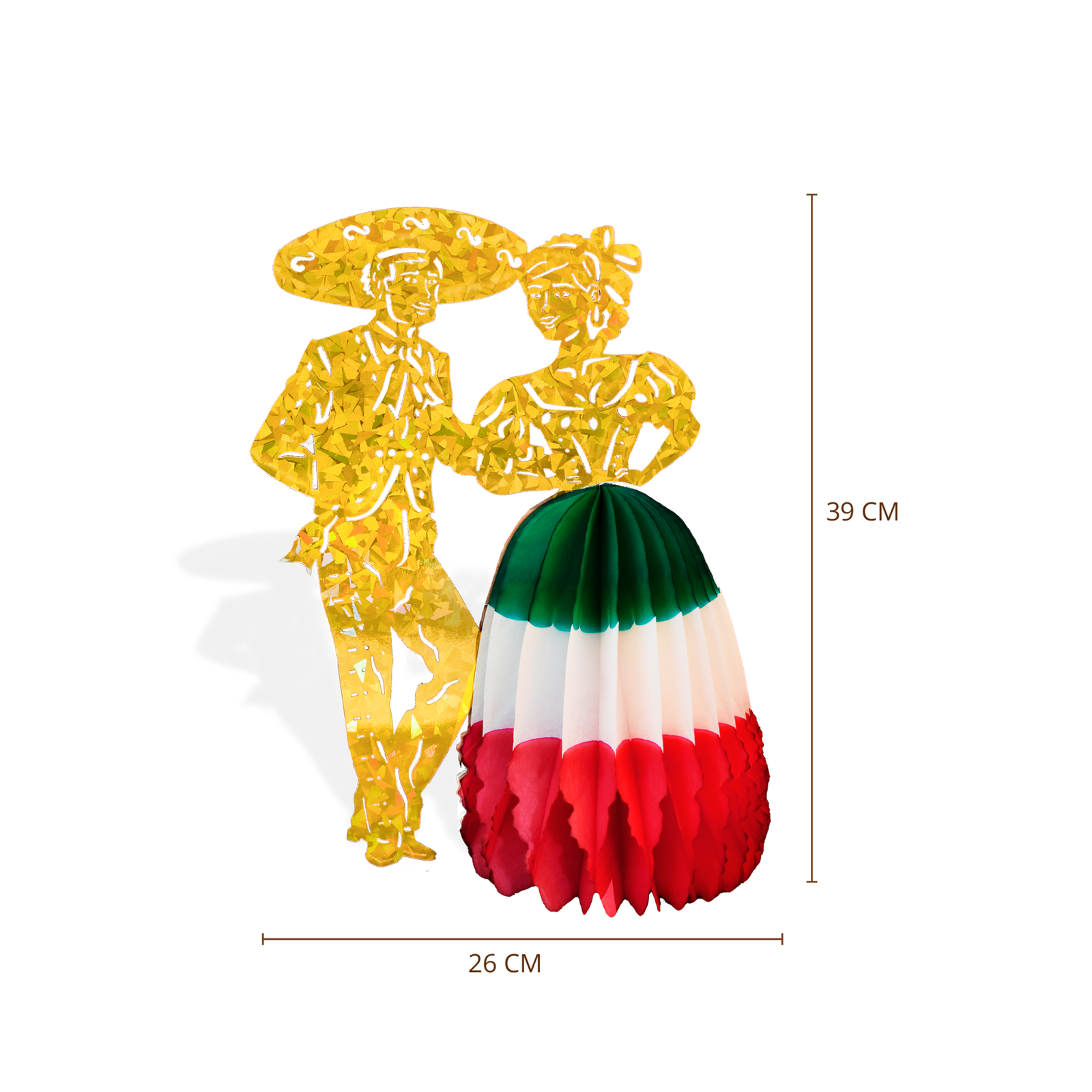 Pareja de charros, elaborada en cartulina holográfica que aporta brillo y elegancia. La figura incluye una falda de papel china en vibrante combinación tricolor, dándole volumen y movimiento. Perfecta para decorar mesas, vitrinas, o colgar en espacios festivos durante las fiestas patrias. Fácil de armar, guardar y reutilizar.