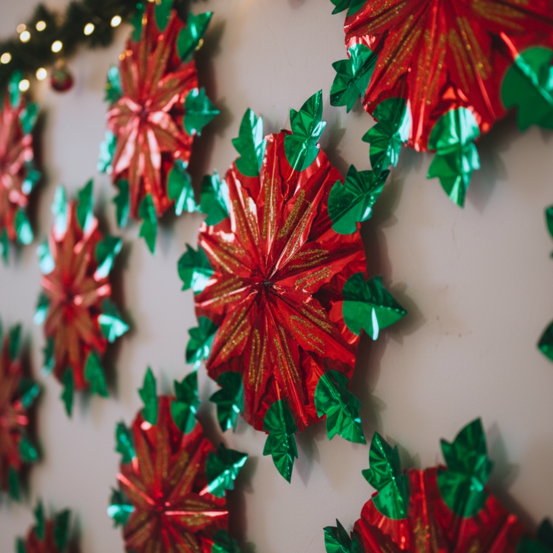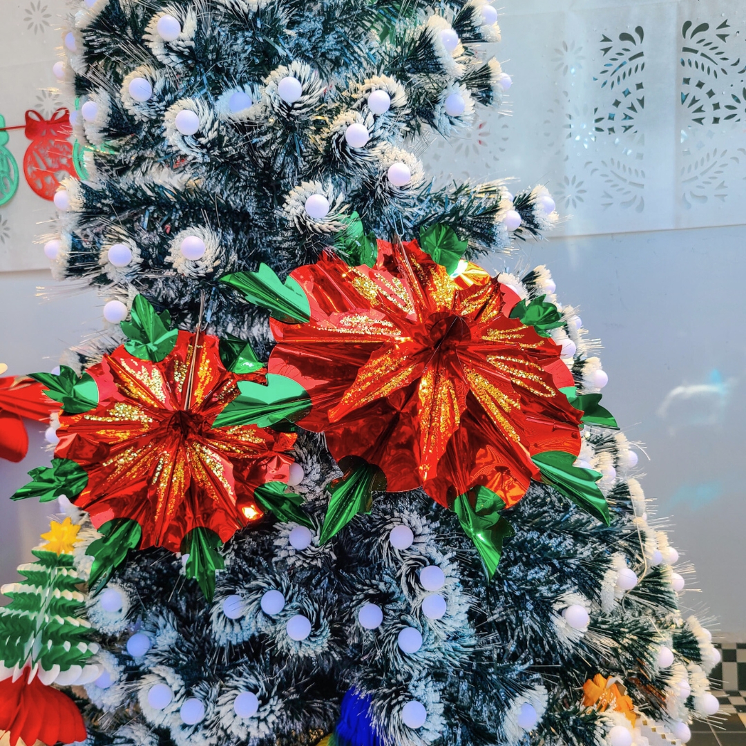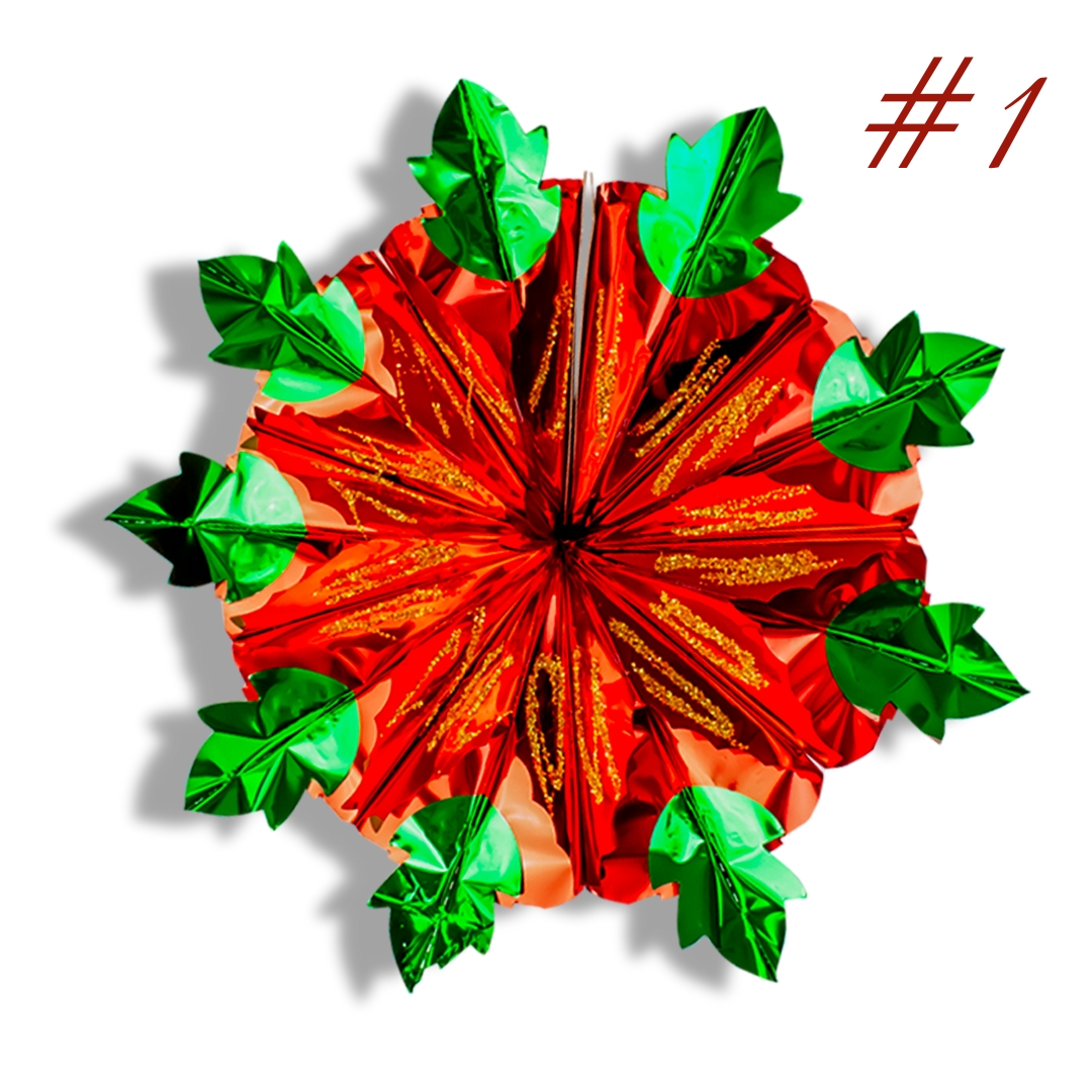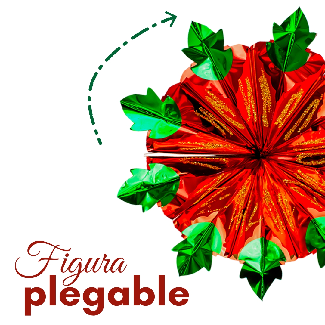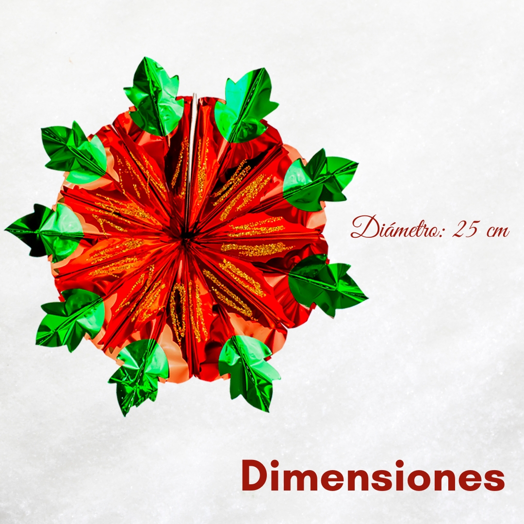 Pascua decorativa hecha de papel metálico rojo con detalles de hojas verdes y toques de diamantina dorada que realzan su brillo. Es ligera, fácil de colocar y perfecta como complemento navideño. Su tamaño pequeño permite decorar puertas, paredes, centros de mesa o armar combinaciones con otras piezas metálicas para un efecto aún más vistoso.