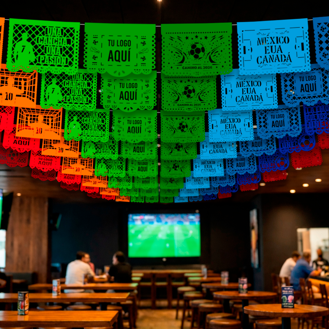 Ideal para bares, restaurantes, eventos deportivos o activaciones, este papel picado no solo decora… comunica. Refuerza tu marca, crea ambiente y convierte cada partido en una oportunidad para destacar. Inspirado en la tradición artesanal mexicana, mantiene ese toque auténtico mientras se adapta a un enfoque moderno y personalizado.
