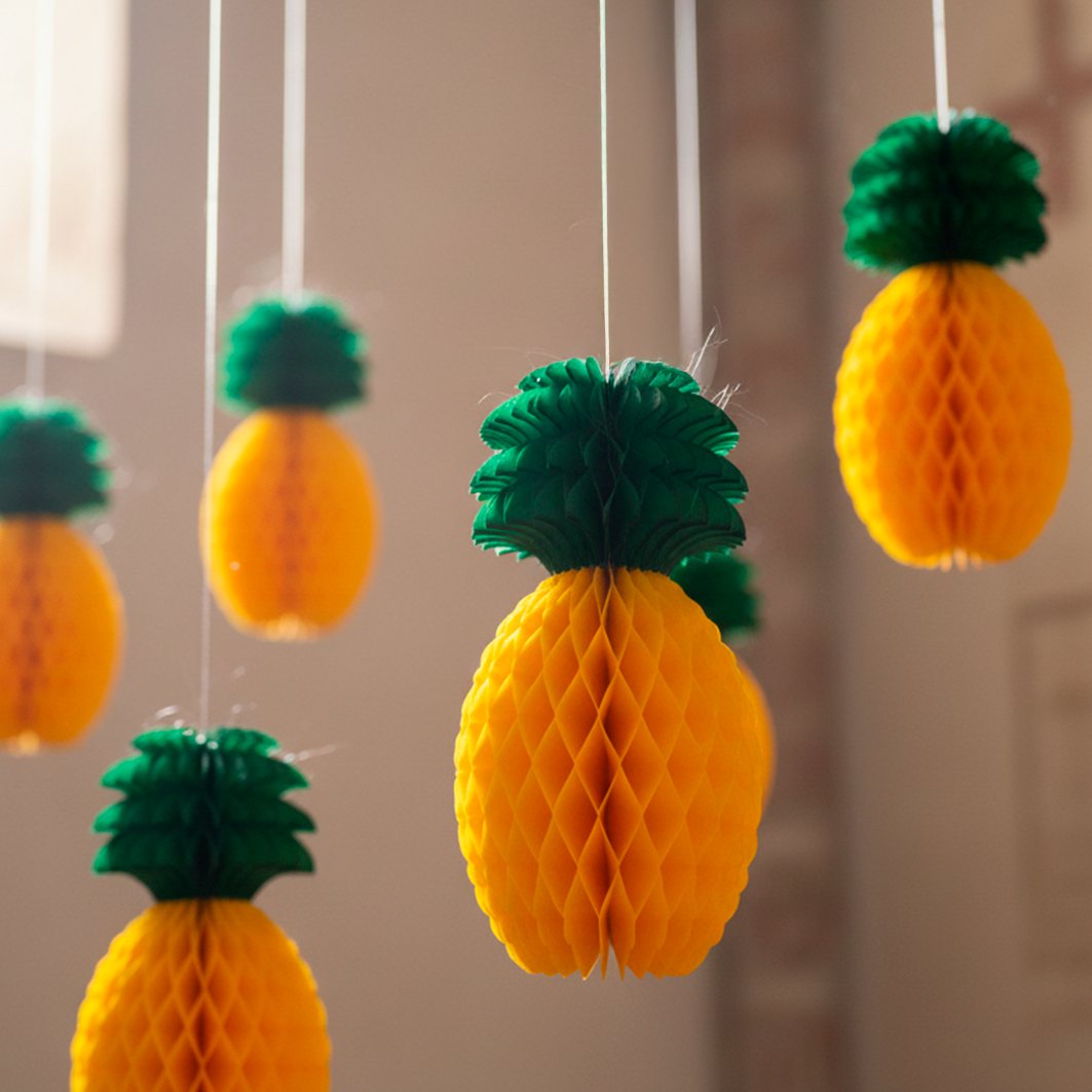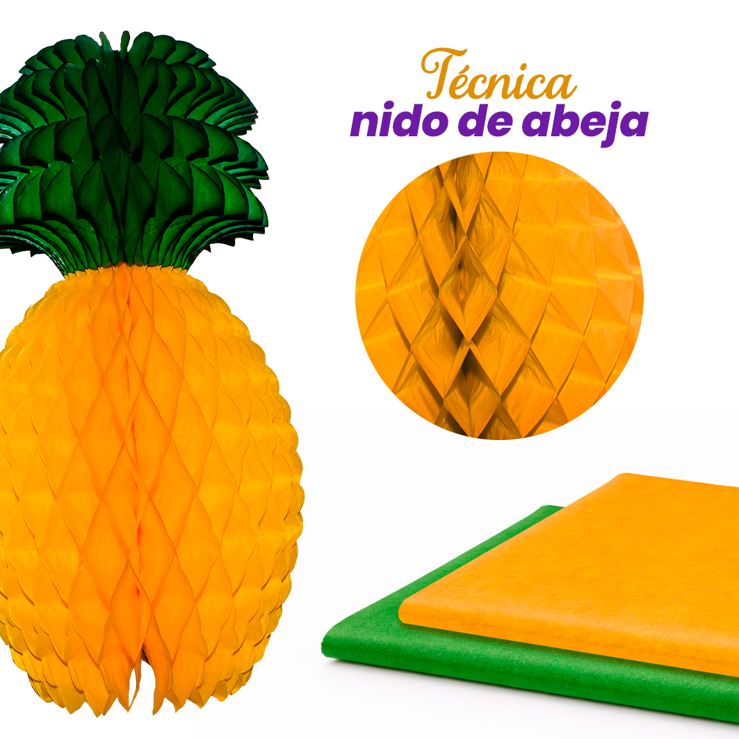 Piña decorativa plegable de papel china, con efecto nido de abeja. Ideal para fiestas y ambientaciones temáticas. Agrégala a tu pedido y complementa tu decoración.