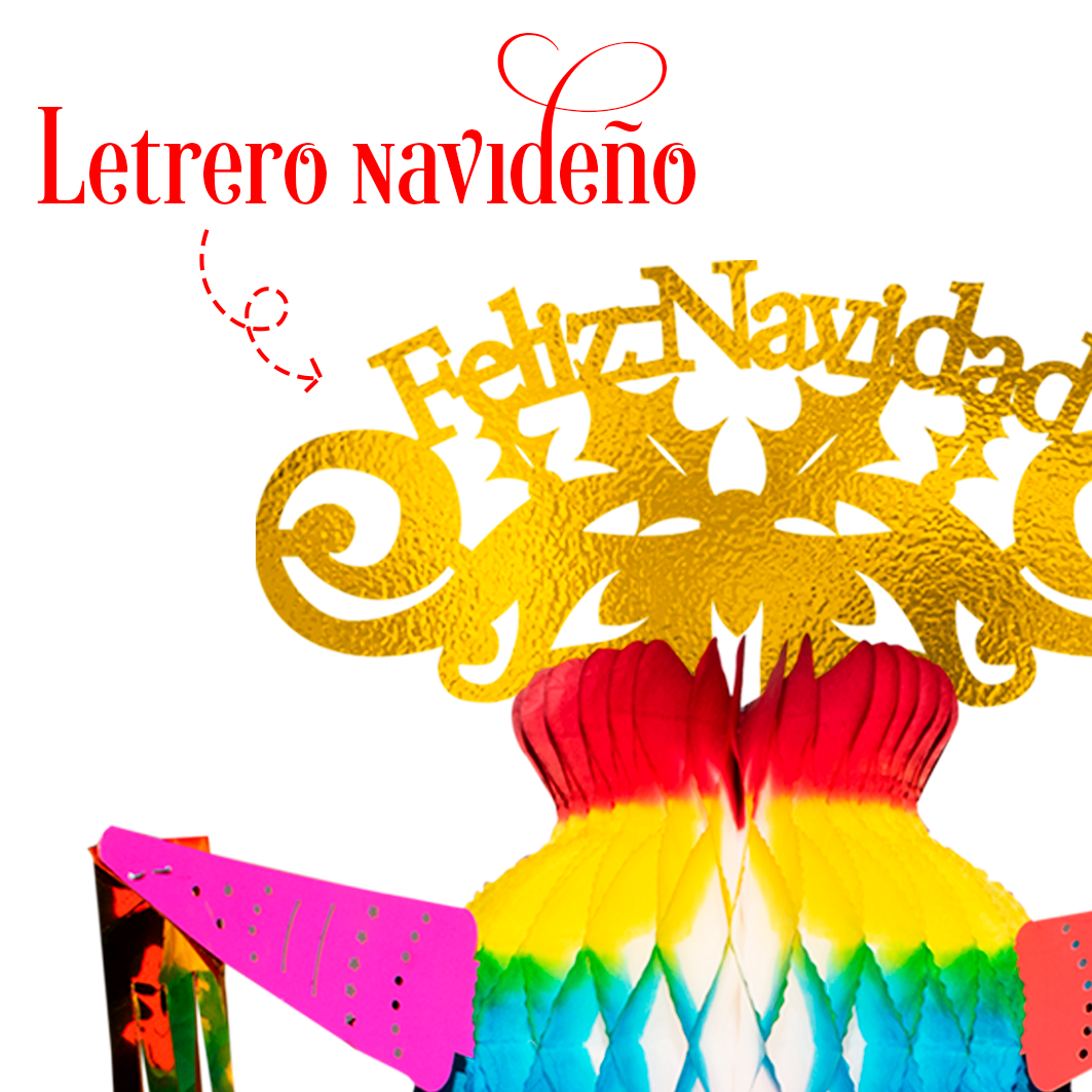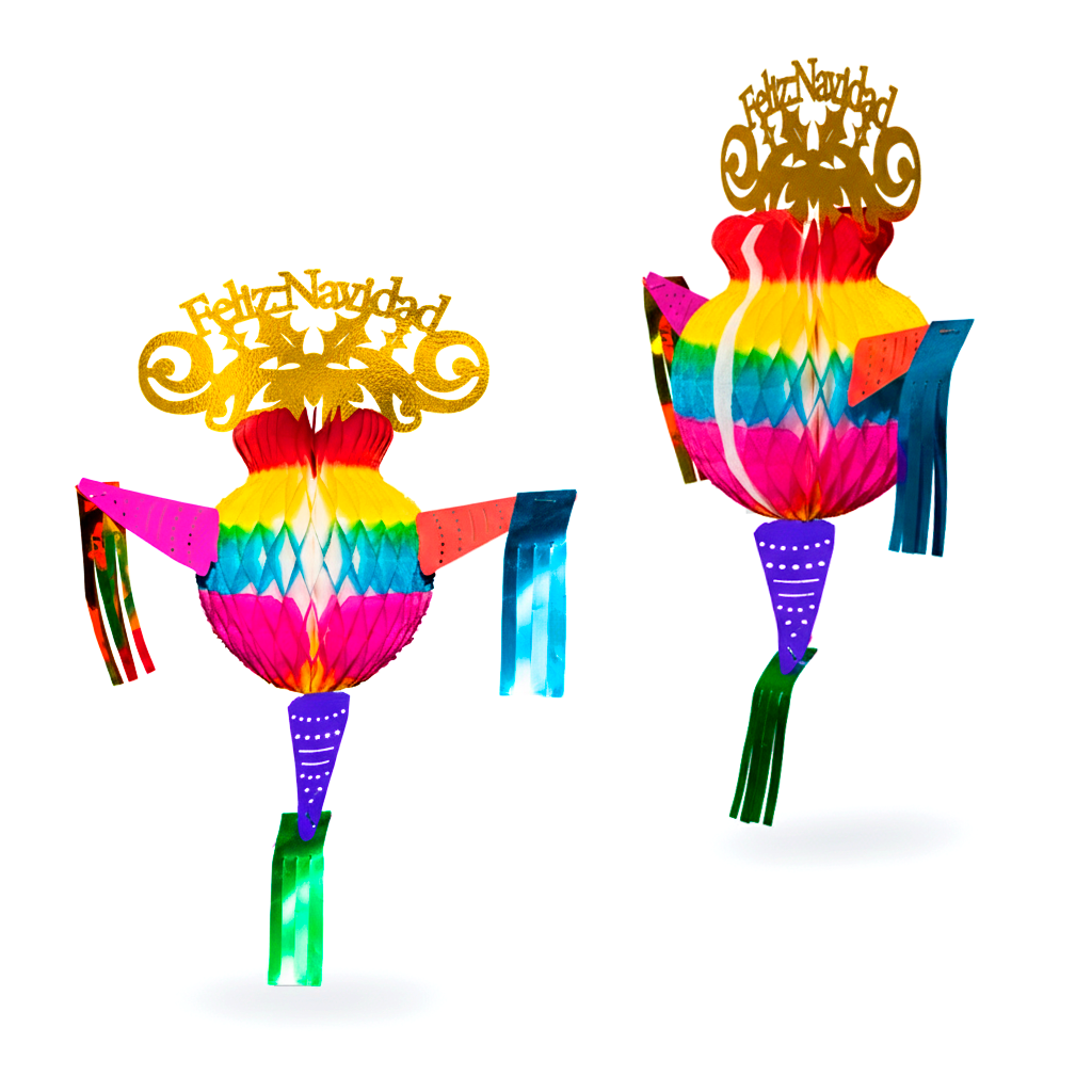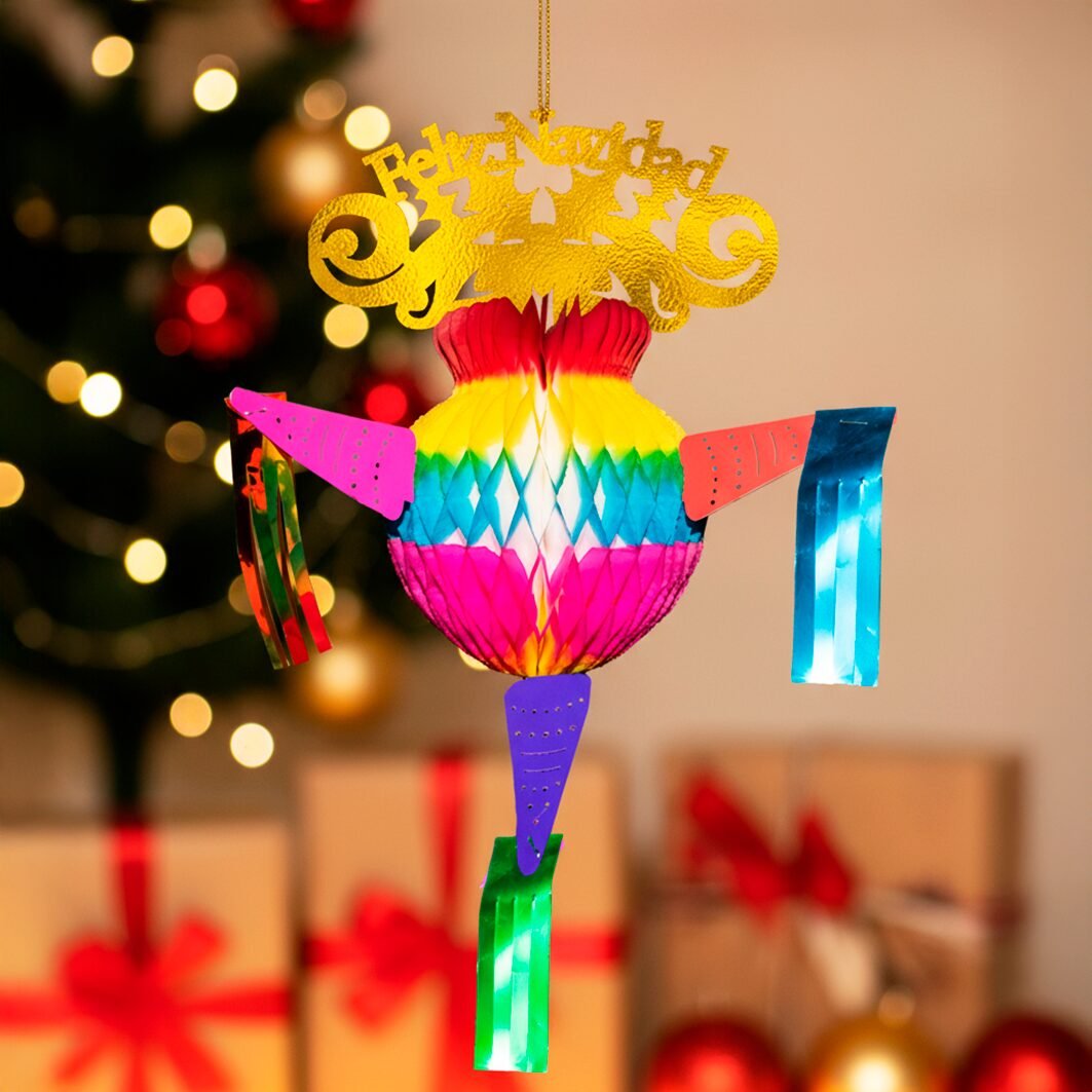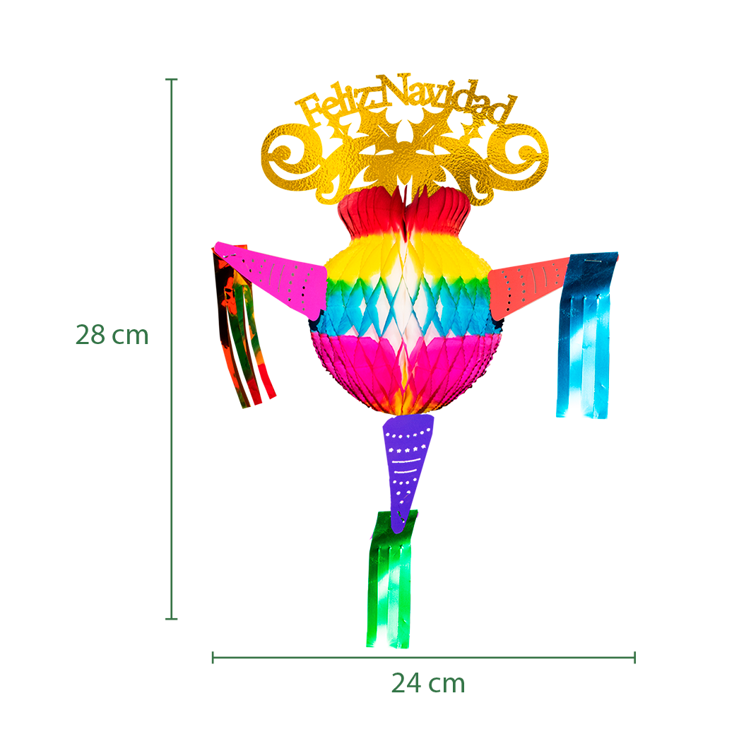 Piñata decorativa fabricada en papel china y cartulina metálica. Su estructura plegable permite transportarla y colgarla fácilmente. Ideal para ambientar espacios en Navidad con un diseño alegre y multicolor.
