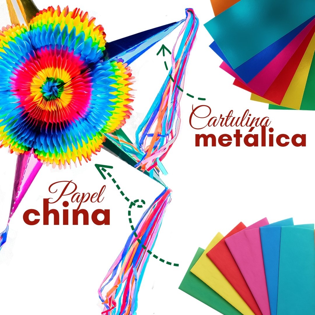 Artículo decorativo tradicional elaborado a mano con papel china multicolor y cartulina brillante, en forma de estrella de 5 picos. Su estructura es plegable, lo que facilita su transporte y almacenamiento sin perder su volumen ni forma.