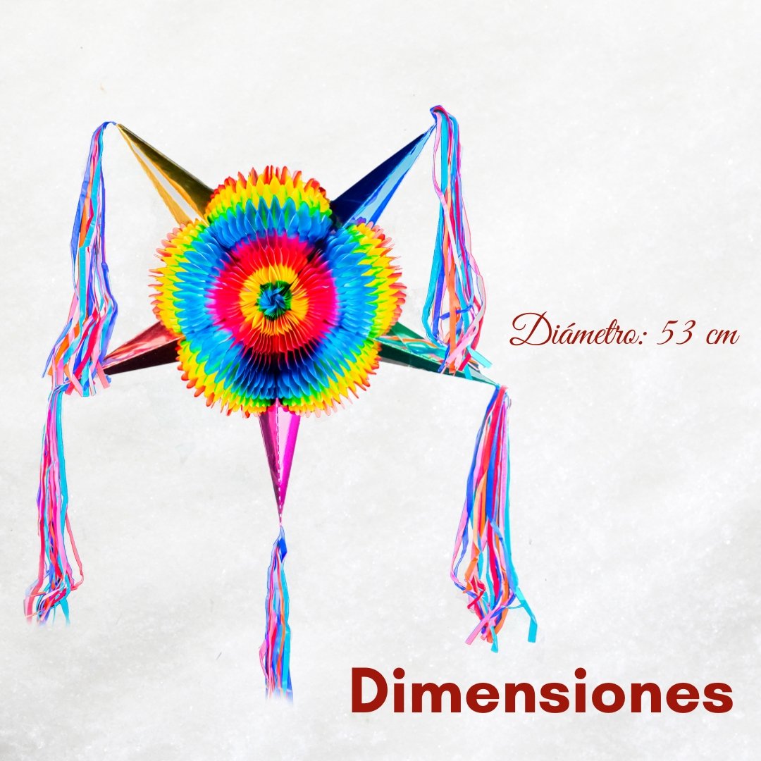 Piñata estrella de 5 picos, hecha de papel china en el centro, picos brillantes y tiras decorativas. Artesanal, multicolor y muy vistosa.