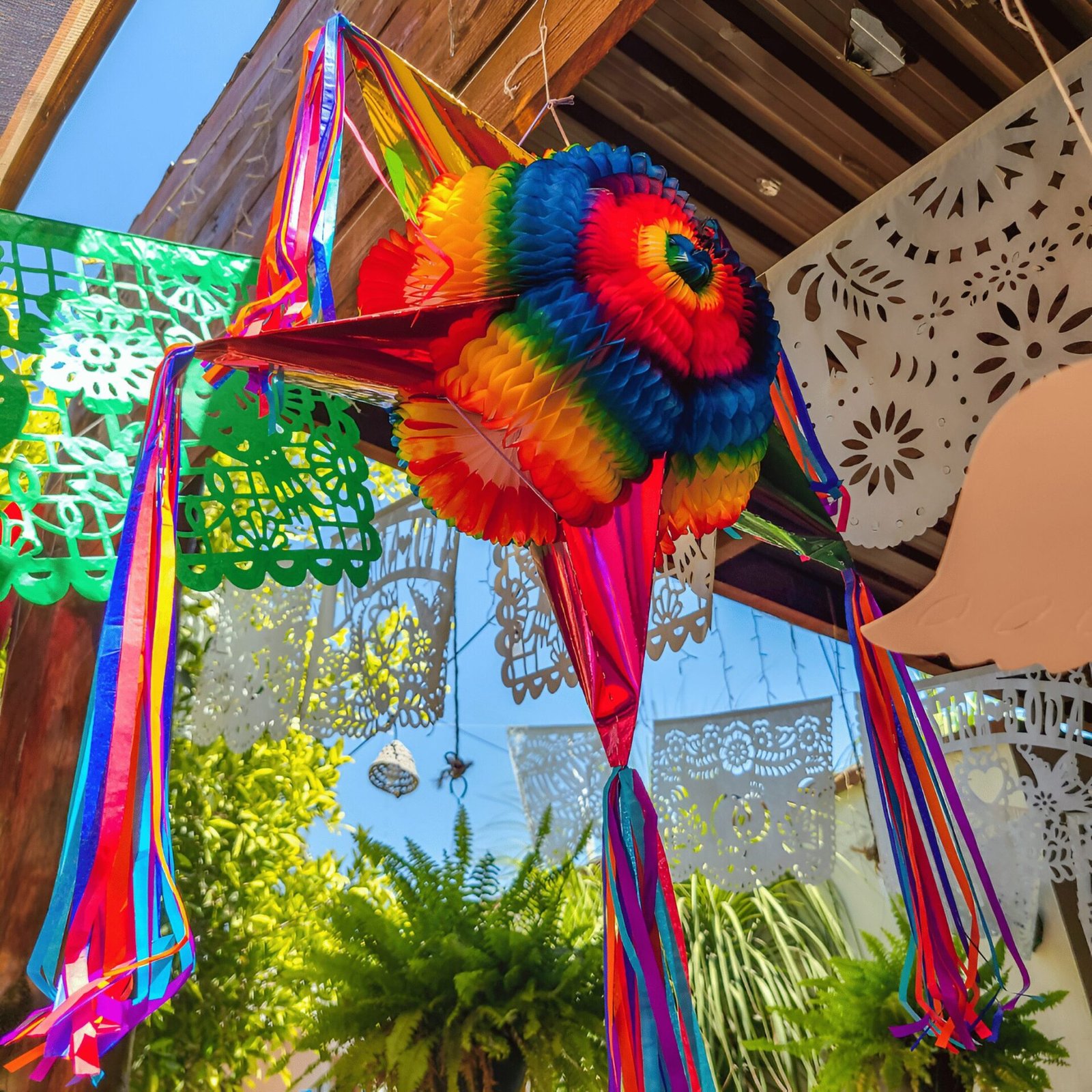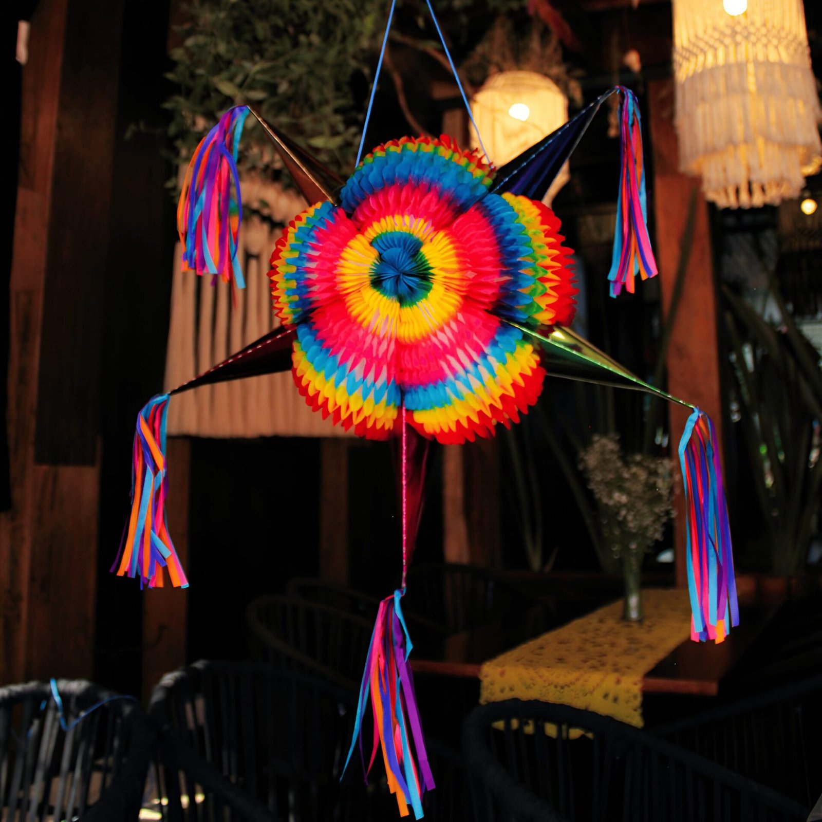 Perfecta para fiestas, posadas, celebraciones mexicanas o como elemento decorativo festivo. Cada pico está adornado con tiras de papel que aportan movimiento y color.