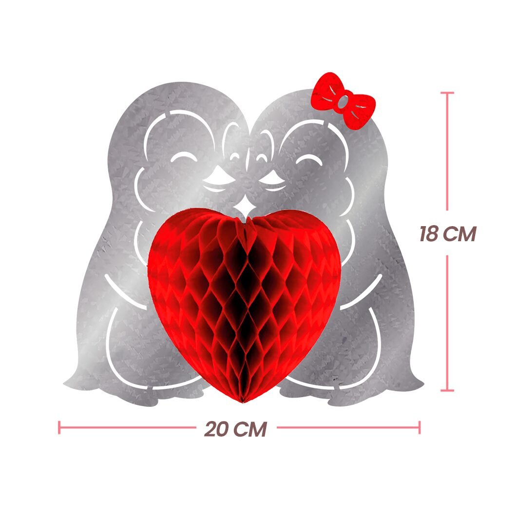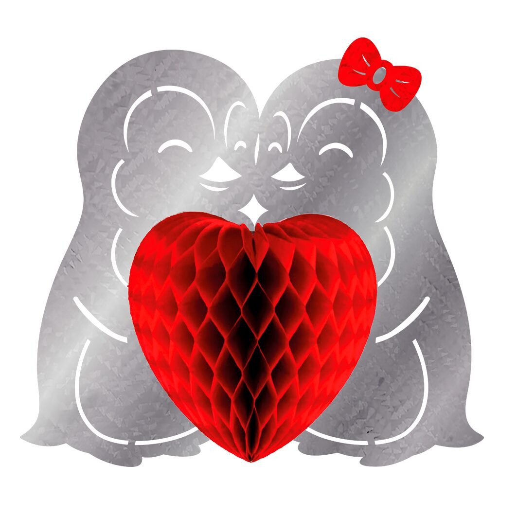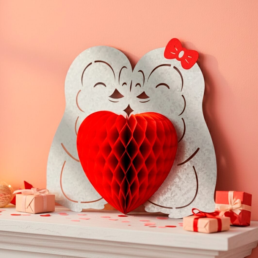La Figura de Pareja Tierna con Corazón es una decoración montable que transmite amor, unión y ternura de una forma encantadora. La silueta muestra a una pareja abrazada, compartiendo un corazón rojo con volumen tipo nido de abeja. Es ideal para San Valentín, aniversarios y celebraciones románticas.
