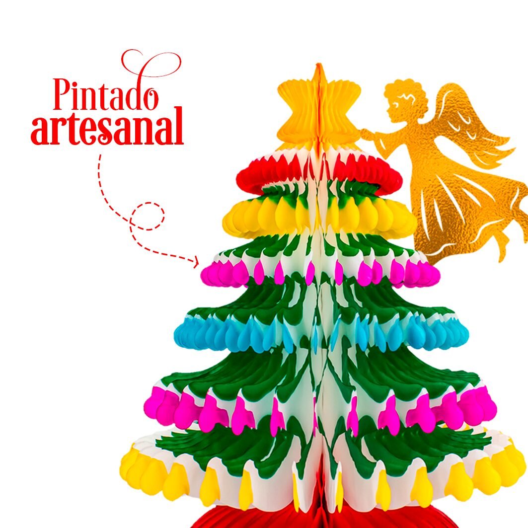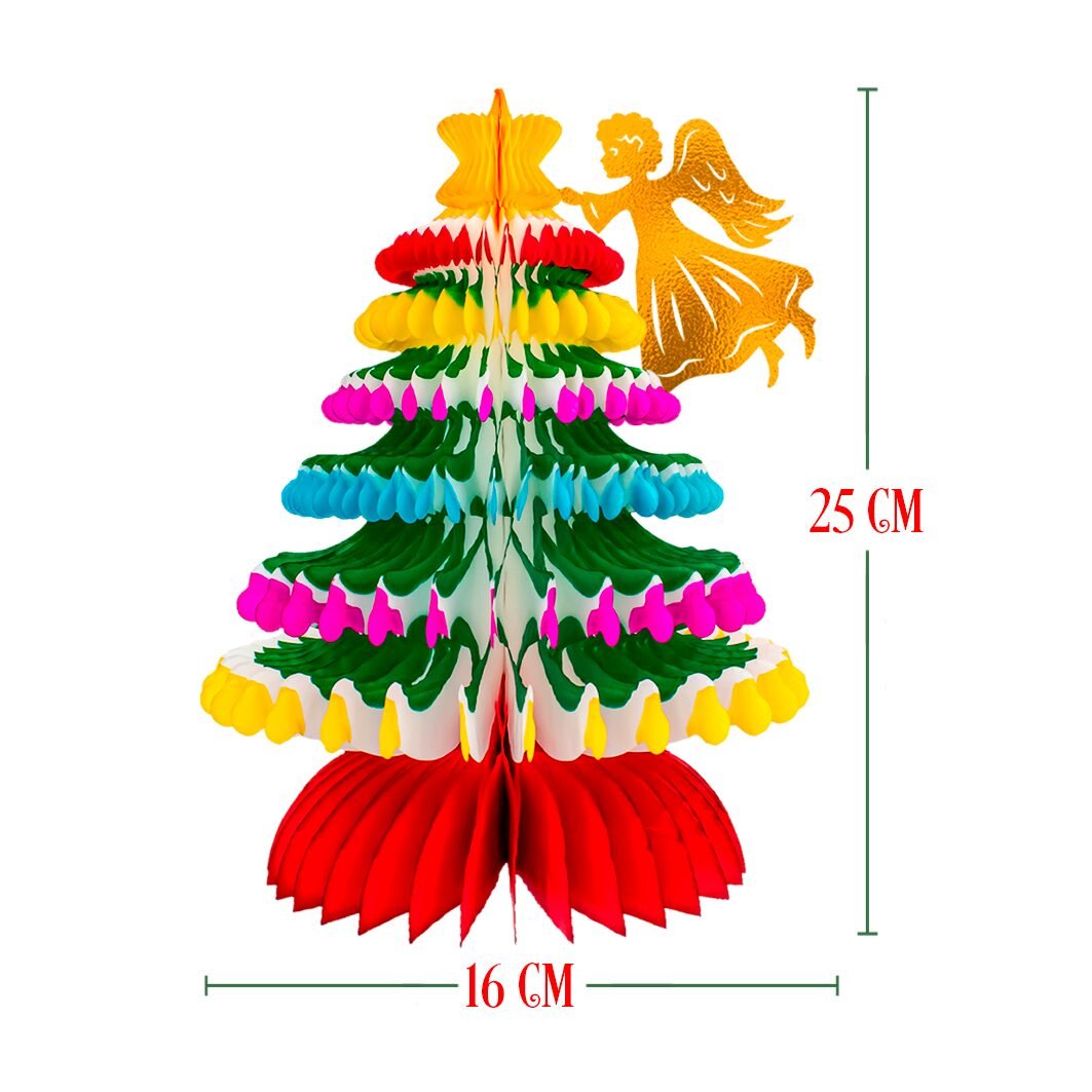 El pino navideño con ángel está diseñado para llenar cada rincón de espíritu festivo. Su forma tridimensional, elaborada con capas multicolor de papel china, ofrece una presencia vibrante que destaca en decoraciones tradicionales o modernas. El ángel dorado en la parte superior aporta un detalle clásico y significativo.