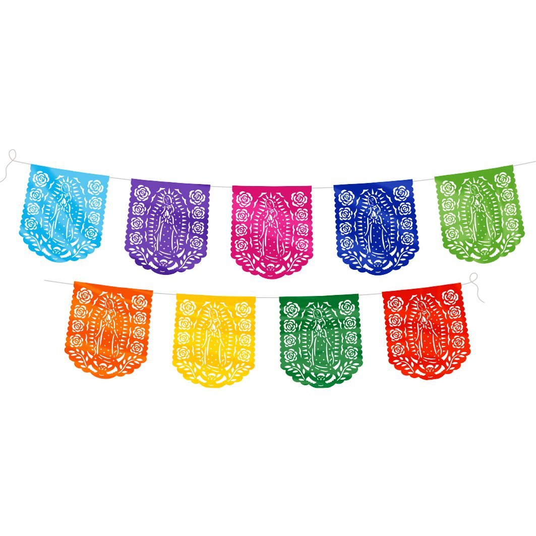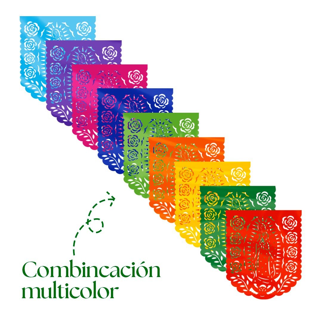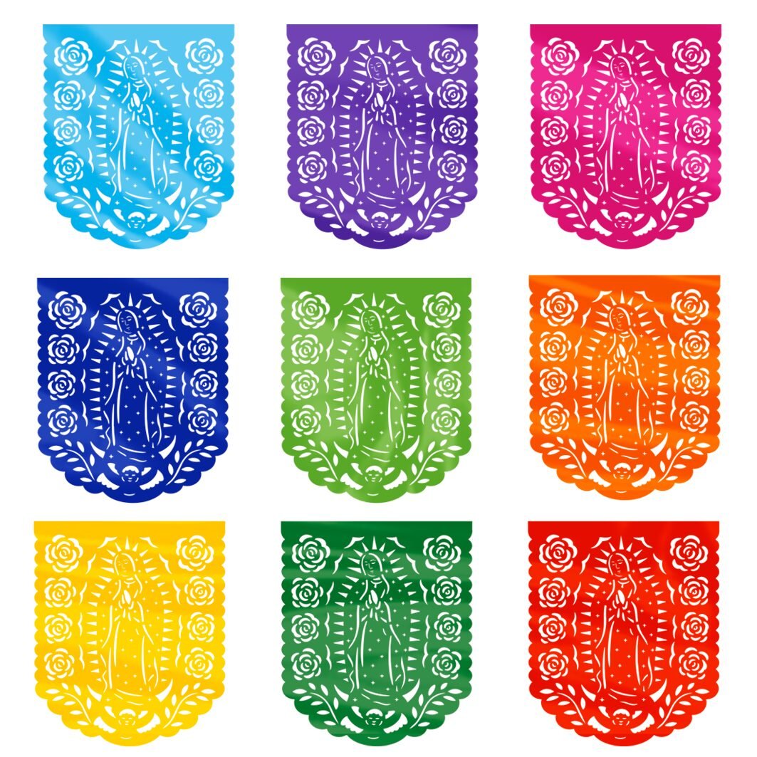 Tira de plástico picado multicolor con diseños de la Virgen de Guadalupe. Paquete con 10 tiras, ideal para altares, calles y celebraciones religiosas.