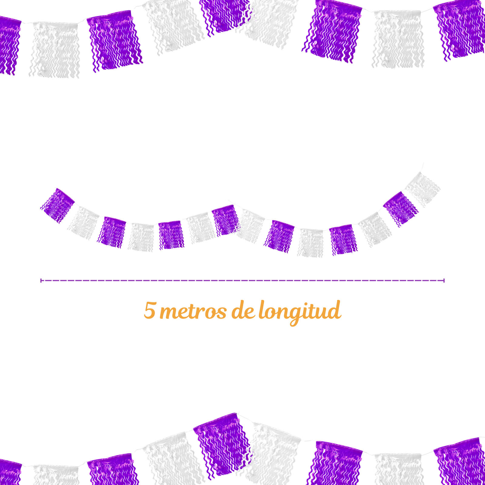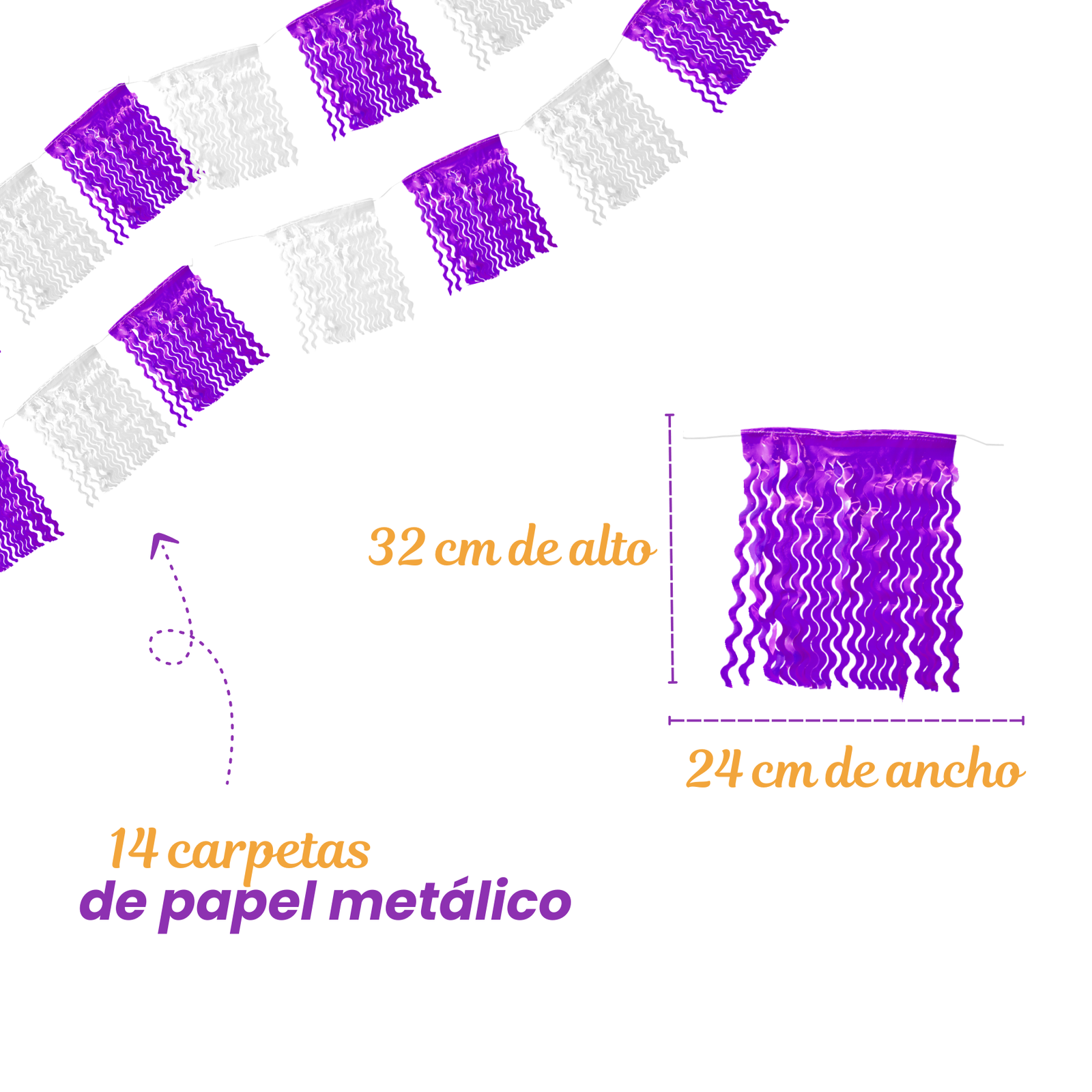 Elaborada en plástico, esta tira incorpora carpetas decorativas con tiras onduladas que generan movimiento visual y aportan textura al montaje. La combinación de colores morado y blanco permite integrarla fácilmente con otros elementos decorativos de temporada. Gracias a su material plástico, es más resistente al manejo y puede utilizarse tanto en interiores como en exteriores protegidos.