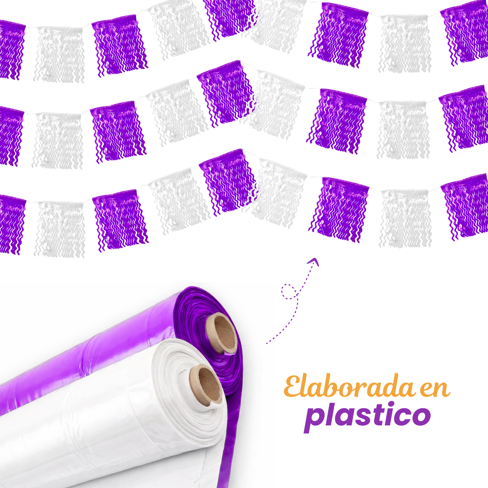 Tira de plástico picado morado y blanco. Ideal para decoración de Semana Santa. Agrégala a tu pedido y completa tu ambientación.