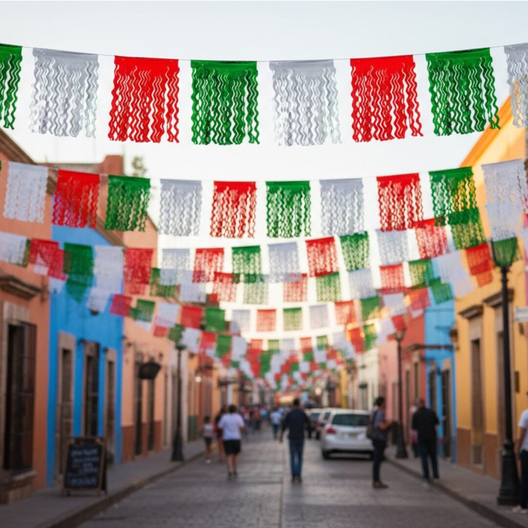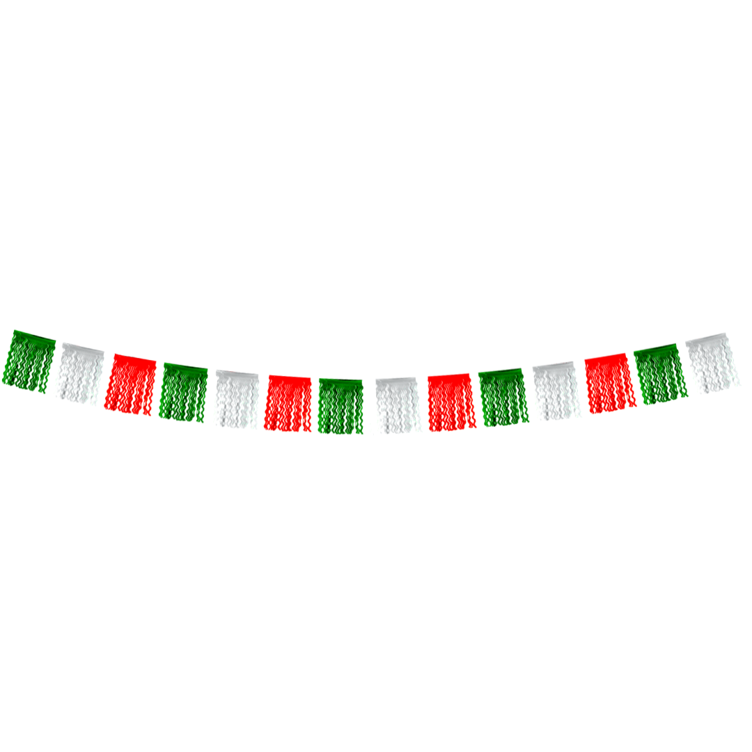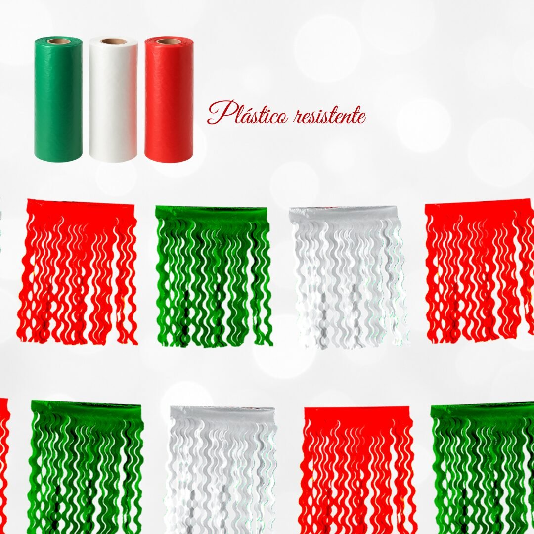 Tira decorativa elaborada en plástico resistente, en los colores patrios: verde, blanco y rojo. Cada carpeta presenta cortes ondulados que generan movimiento y brillo al colgarse. Es una opción duradera y vistosa, ideal para decorar techos, entradas, marcos o pasillos en celebraciones mexicanas. También conocida como “tira hawaiana” por su forma dinámica y su efecto decorativo al aire libre o en interiores.