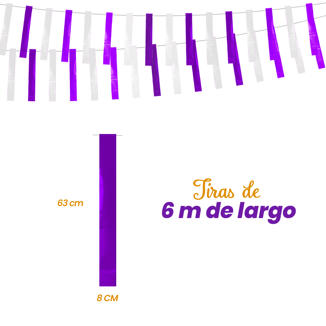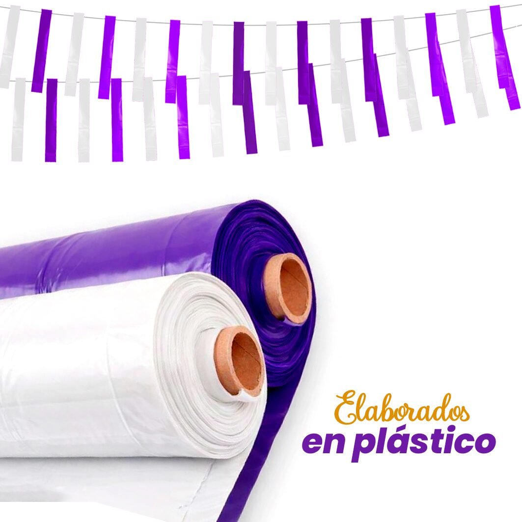 Decora tus espacios con el Plástico Picado en Tiras Tiliches Blanco-Morado, ideal para fiestas y eventos. Dale color a tu celebración y agrégalo hoy mismo.
