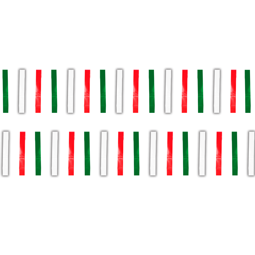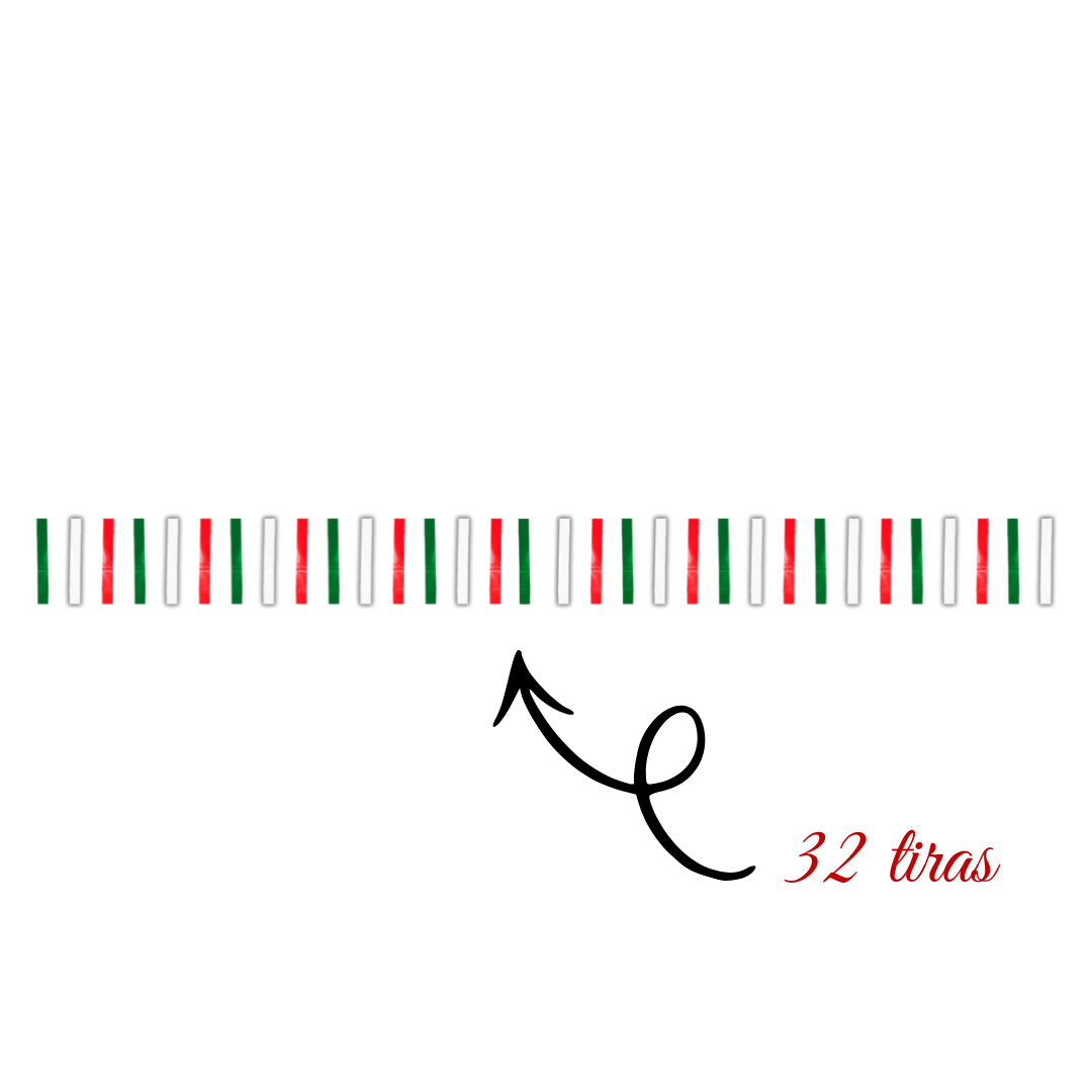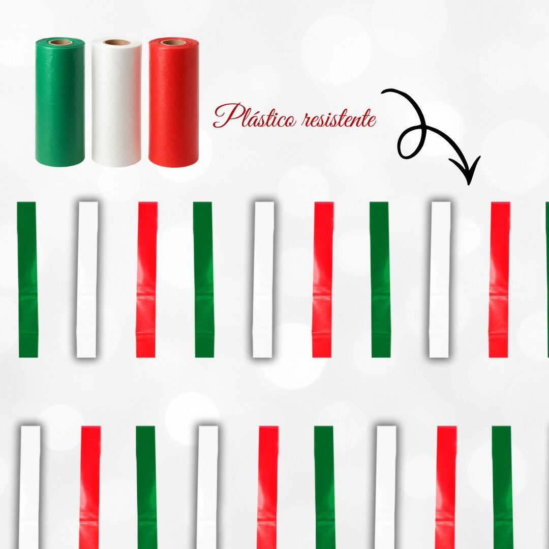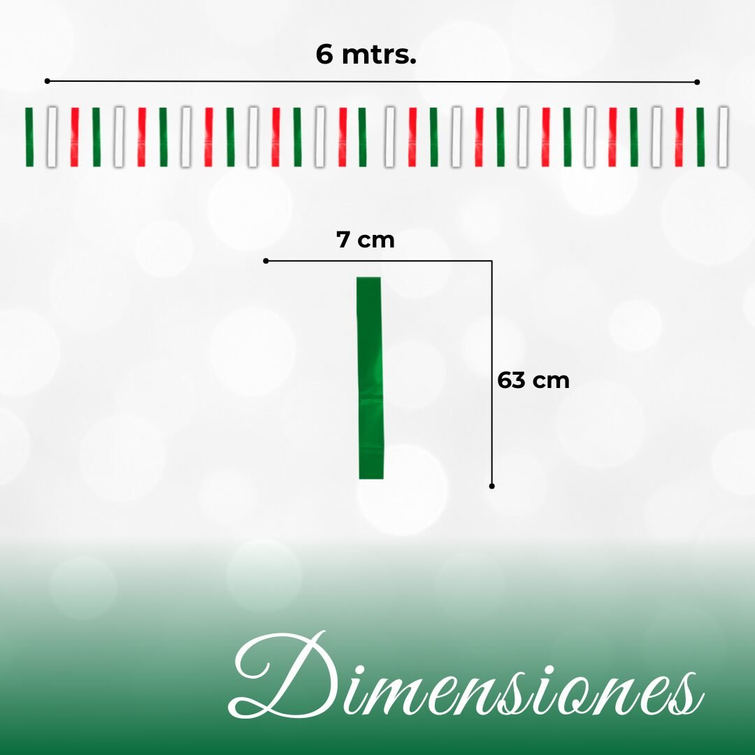 Tira decorativa de plástico, mejor conocida como tiliches o lluvia, elaborada con 32 pequeñas tiras que al colocarse generan un efecto visual dinámico y festivo. Su gama tricolor —verde, blanco y rojo— la convierte en una opción ideal para celebraciones patrias o decoraciones llamativas. Está hecha de plástico resistente, perfecta para exteriores, y mide 6 metros de largo, lo que permite cubrir espacios amplios con facilidad. Su instalación es rápida y práctica, ideal para eventos, calles o fachadas.