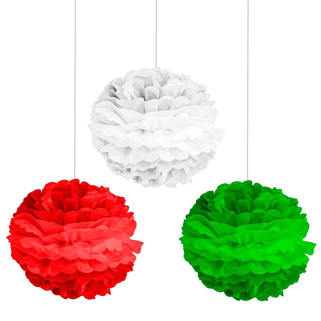 Pompón decorativo tricolor número 2, elaborado en papel china. ¡Agrega volumen y tradición a tus espacios con estos vibrantes colores mexicanos!