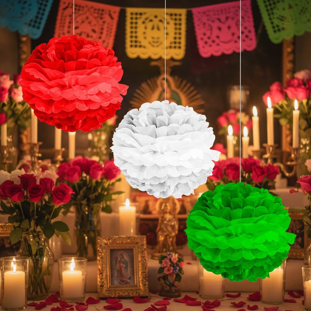Pompón decorativo elaborado en papel china, disponible en colores verde bandera, blanco y rojo. Se vende de forma individual por pieza, ideal para dar volumen, color y un aire festivo a altares, vitrinas o espacios temáticos. Perfecto para crear ambientes llenos de tradición mexicana y orgullo nacional.