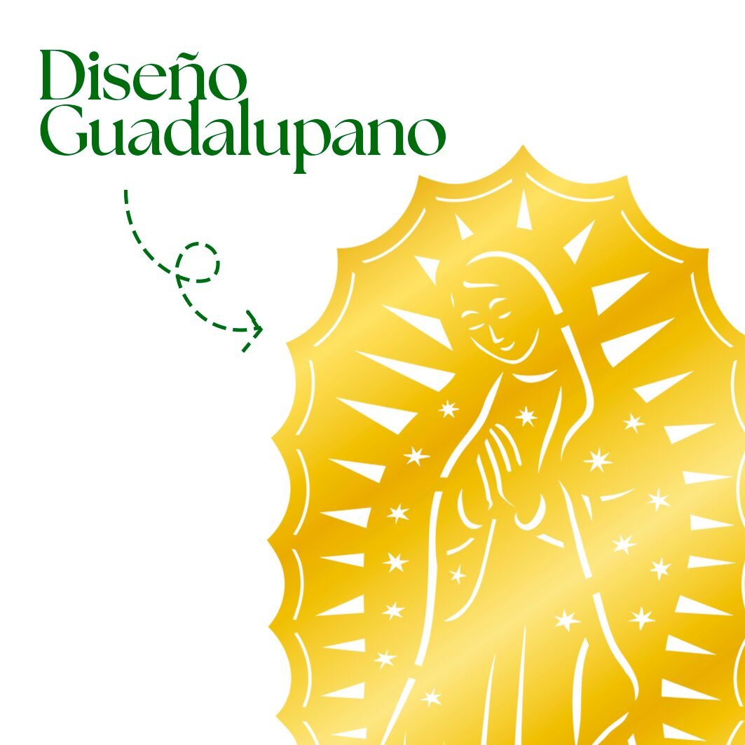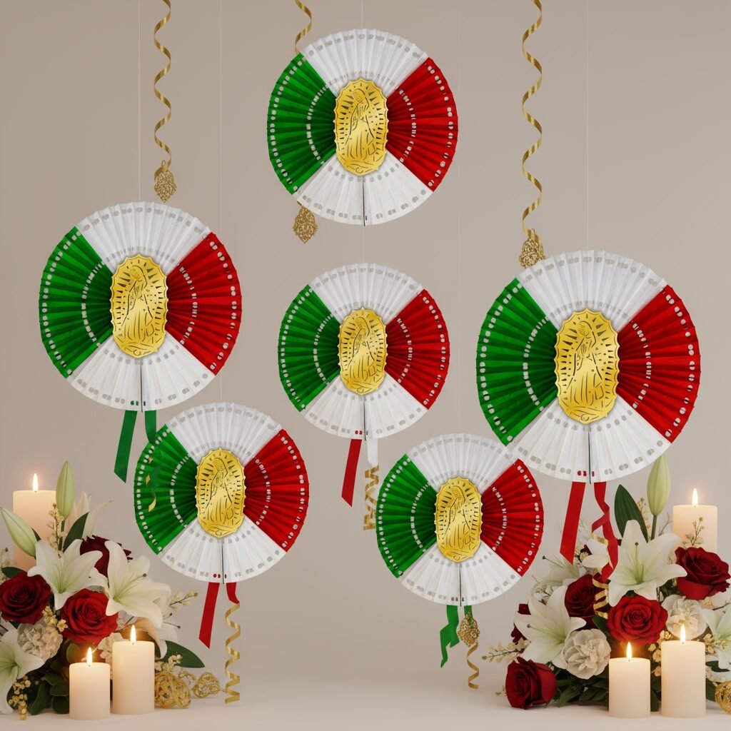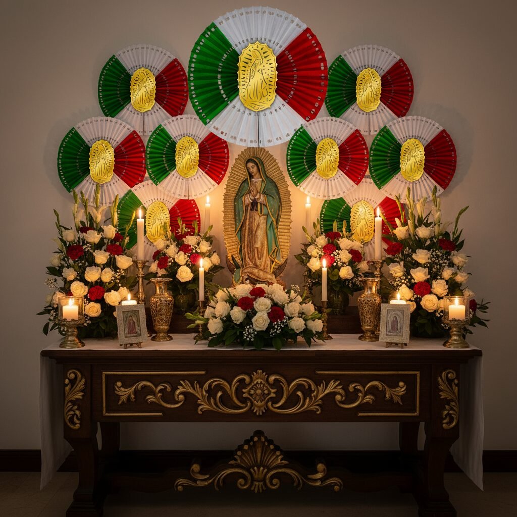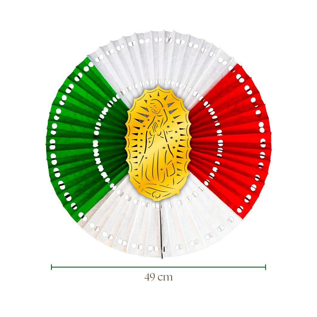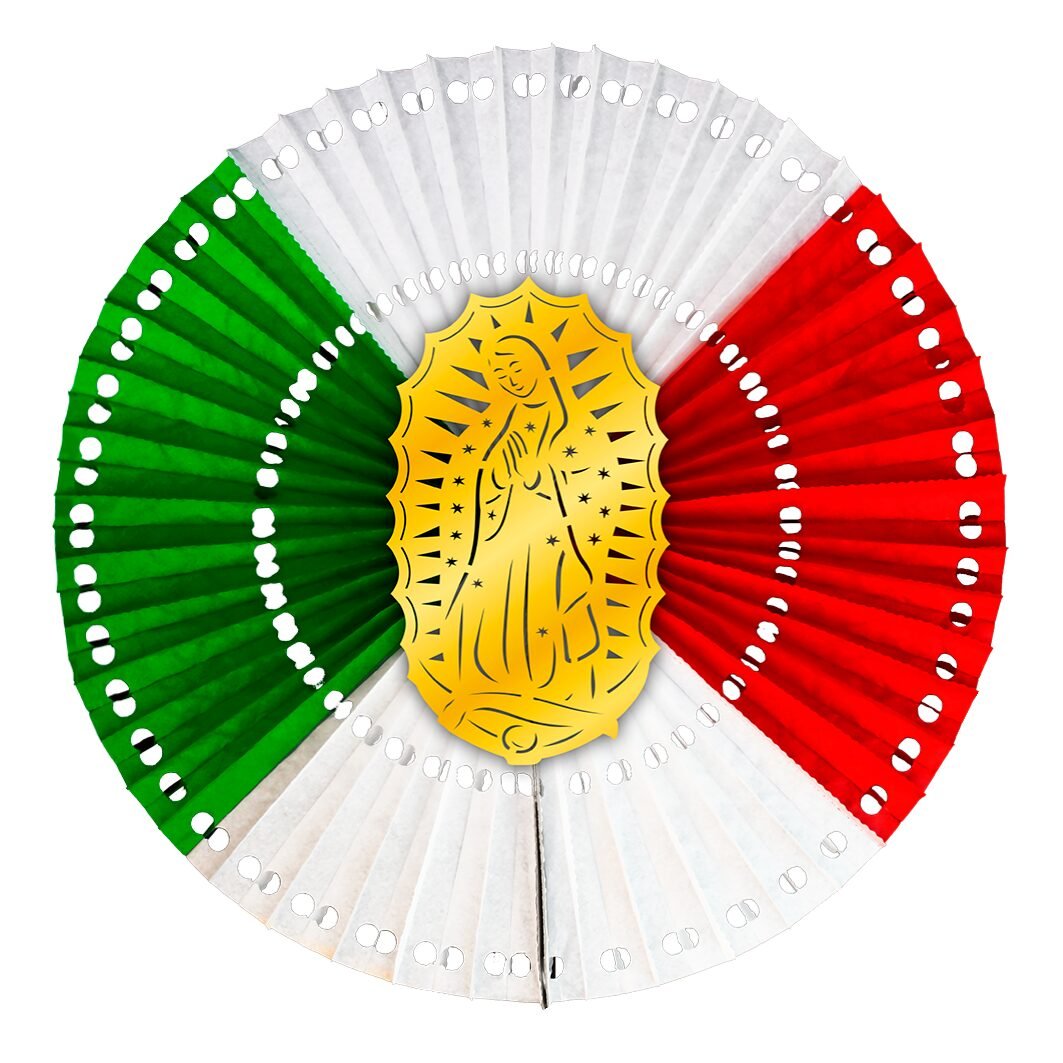 Roseta tricolor con imagen de la Virgen de Guadalupe. Decora altares con color, devoción, tradición y espíritu mexicano auténtico.