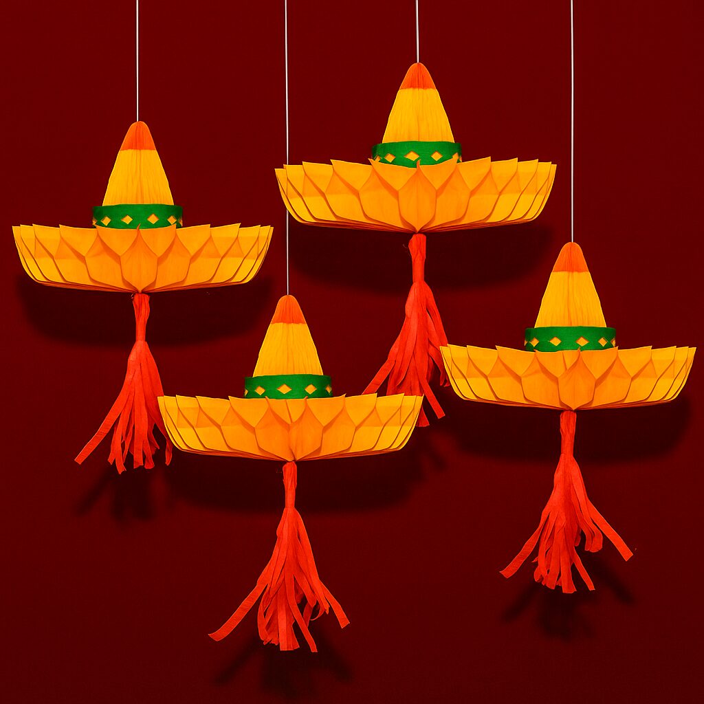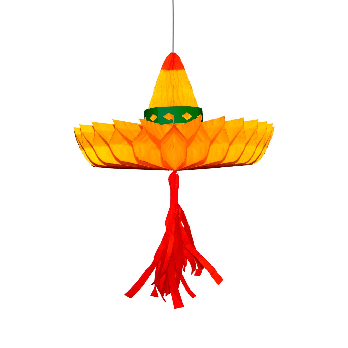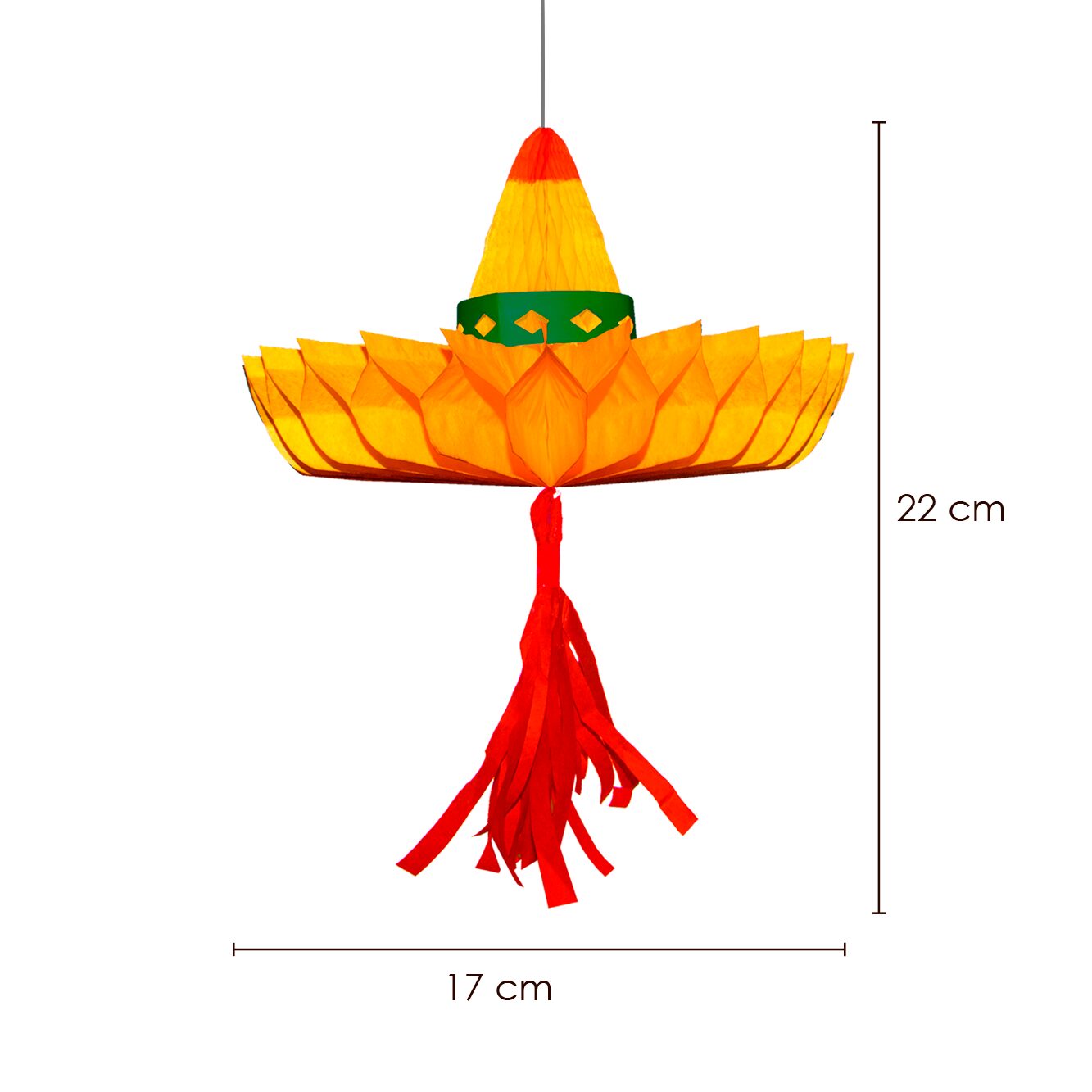 Figura colgante en forma de sombrero, hecha con papel china en técnica nido de abeja y decorada con cartulina y pompón. ¡Ideal para colgar!