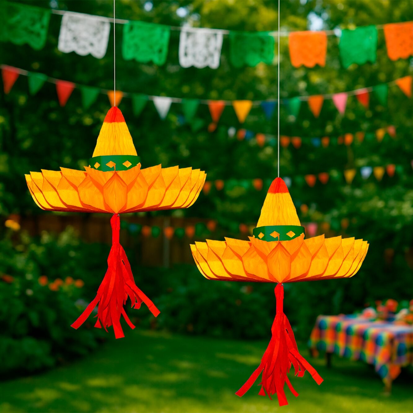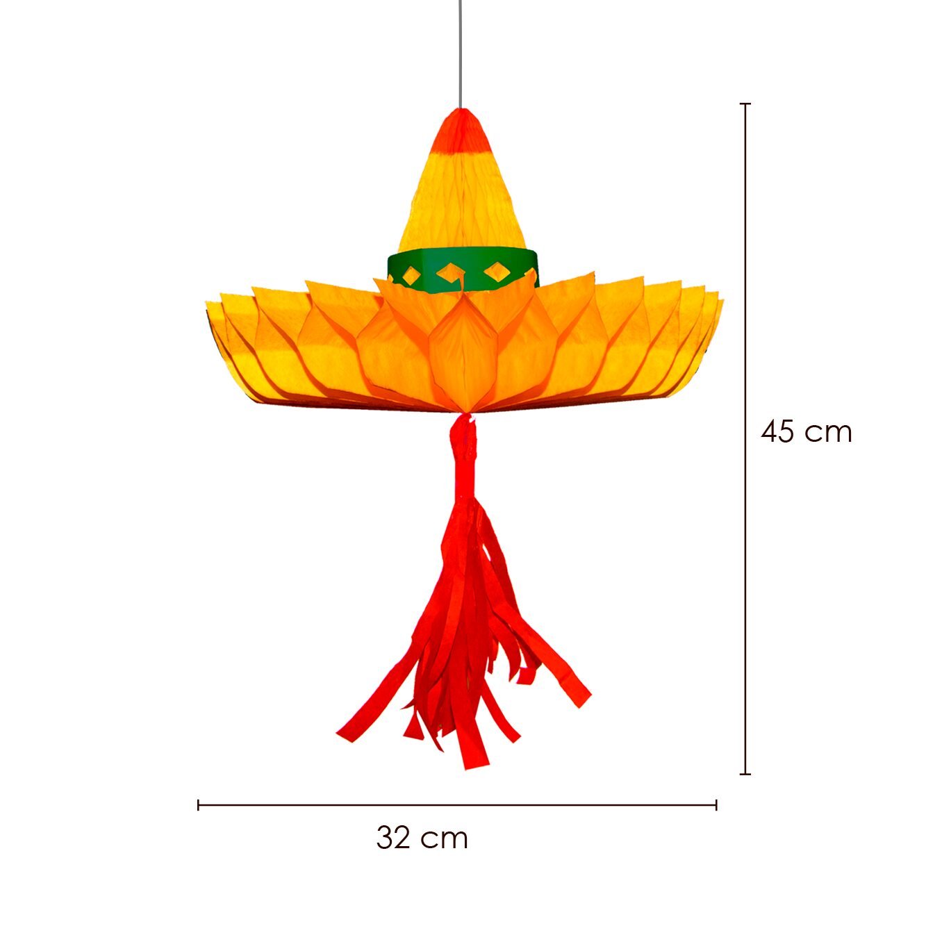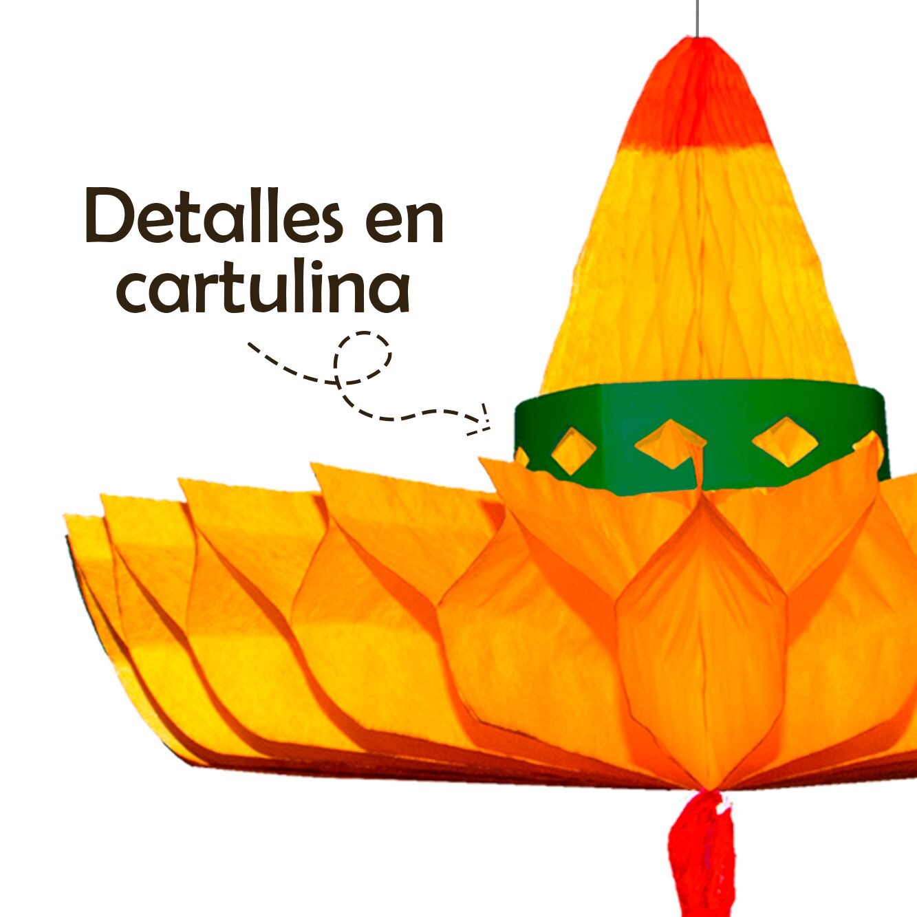 Añade un toque tradicional y llamativo con esta figura colgante en forma de sombrero, elaborada artesanalmente en papel china con la técnica de nido de abeja, lo que le da volumen y textura. Decorada con detalles en cartulina y acompañada de un colorido pompón de papel, es perfecta para colgar en fiestas patrias y ambientar con estilo y originalidad cualquier espacio.