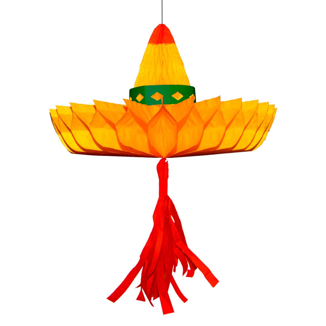 Figura colgante en forma de sombrero, hecha con papel china en técnica nido de abeja y decorada con cartulina y pompón. ¡Ideal para colgar!