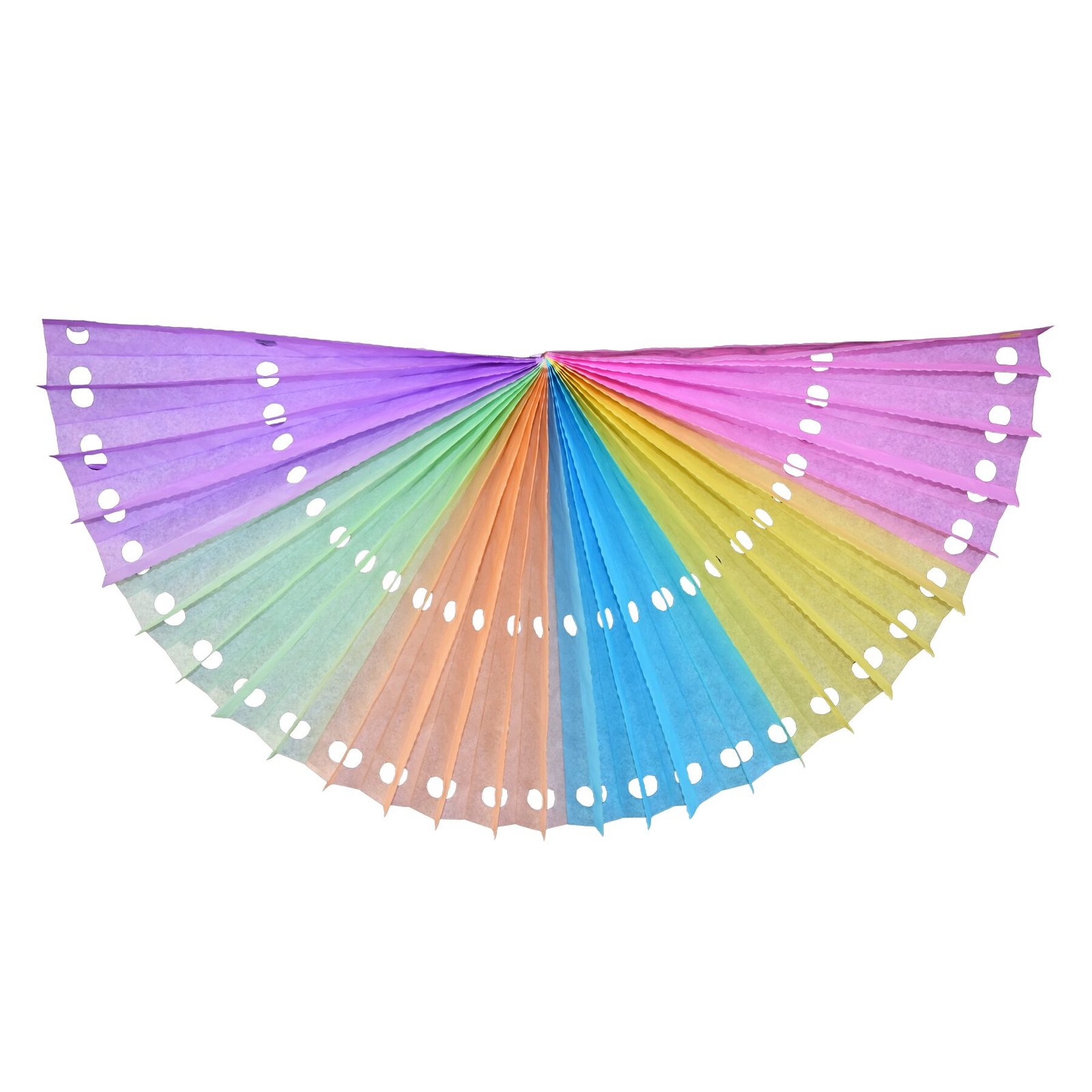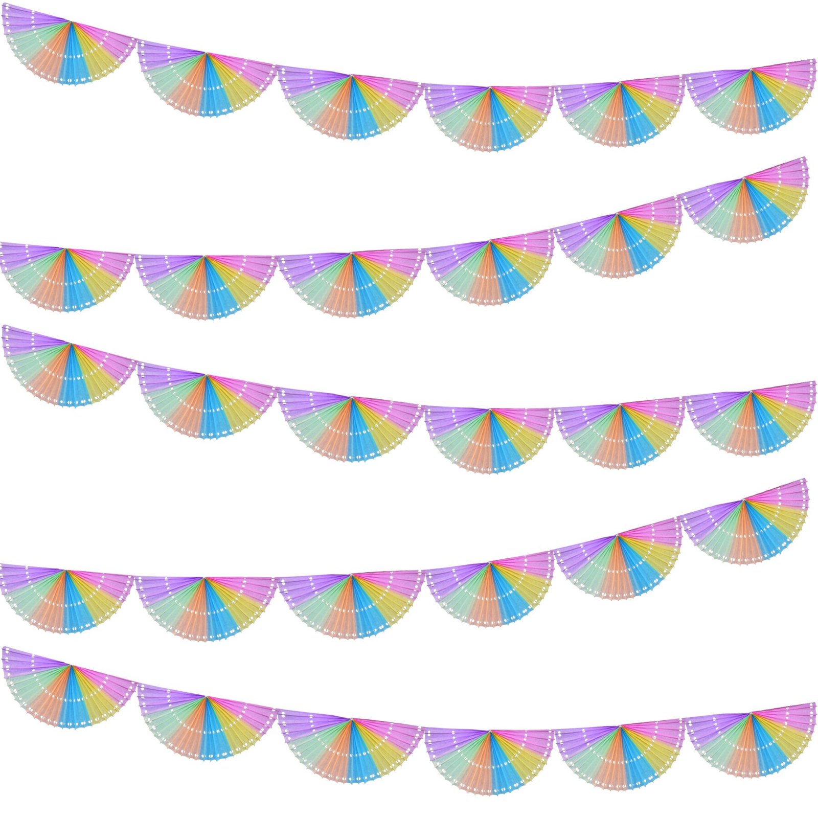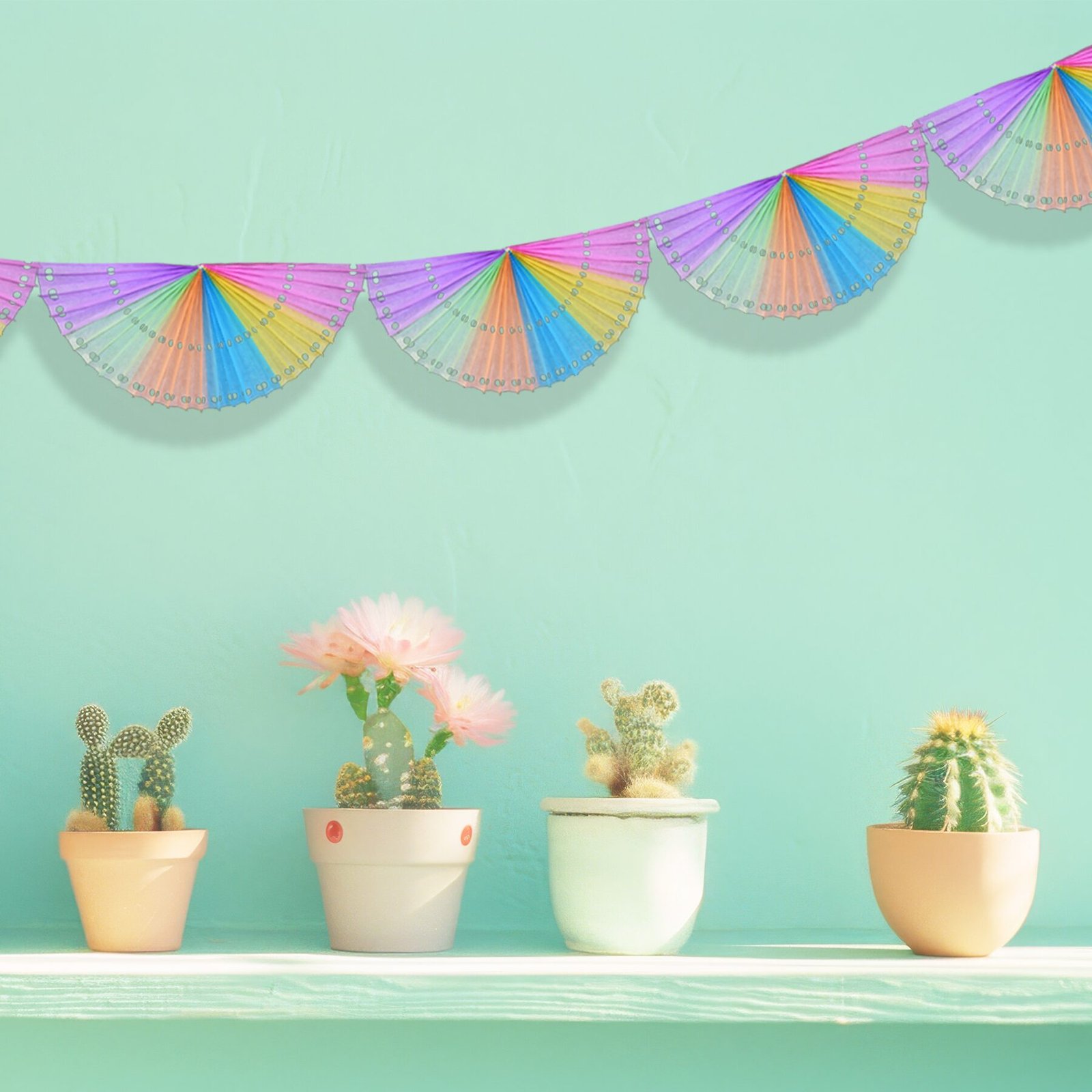 Tira decorativa con abanicos de papel en combinación de tonos pastel, perfecta para transformar cualquier rincón en una fiesta de alegría. Ideal para colgar en techos, paredes o entradas y darle un toque artesanal, colorido y primaveral a tus celebraciones.