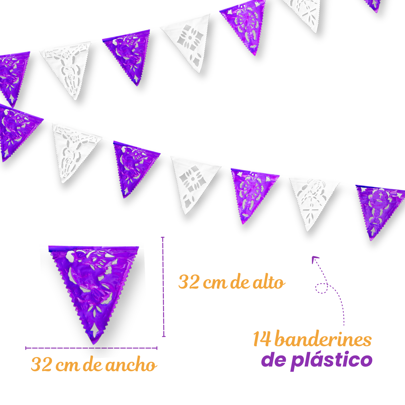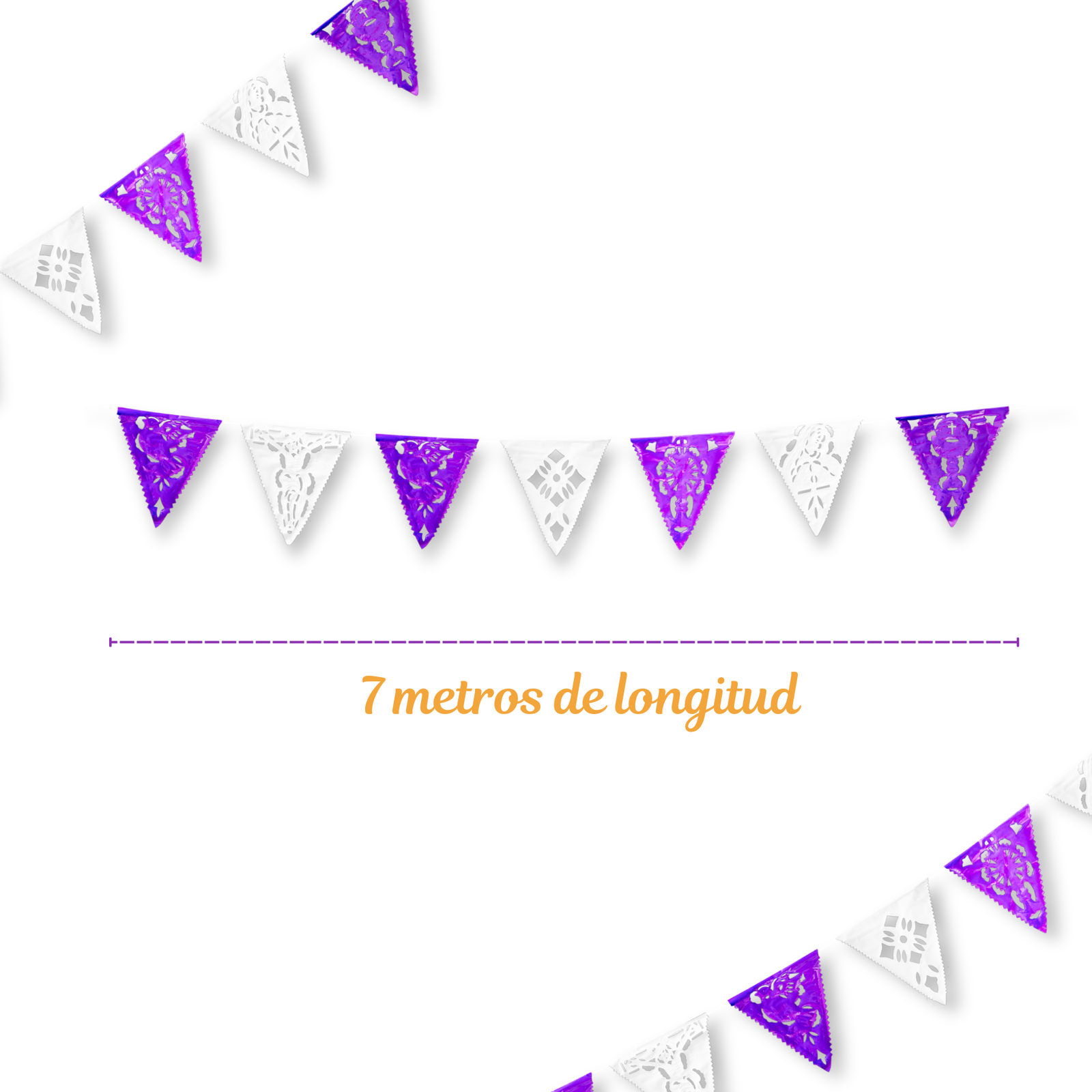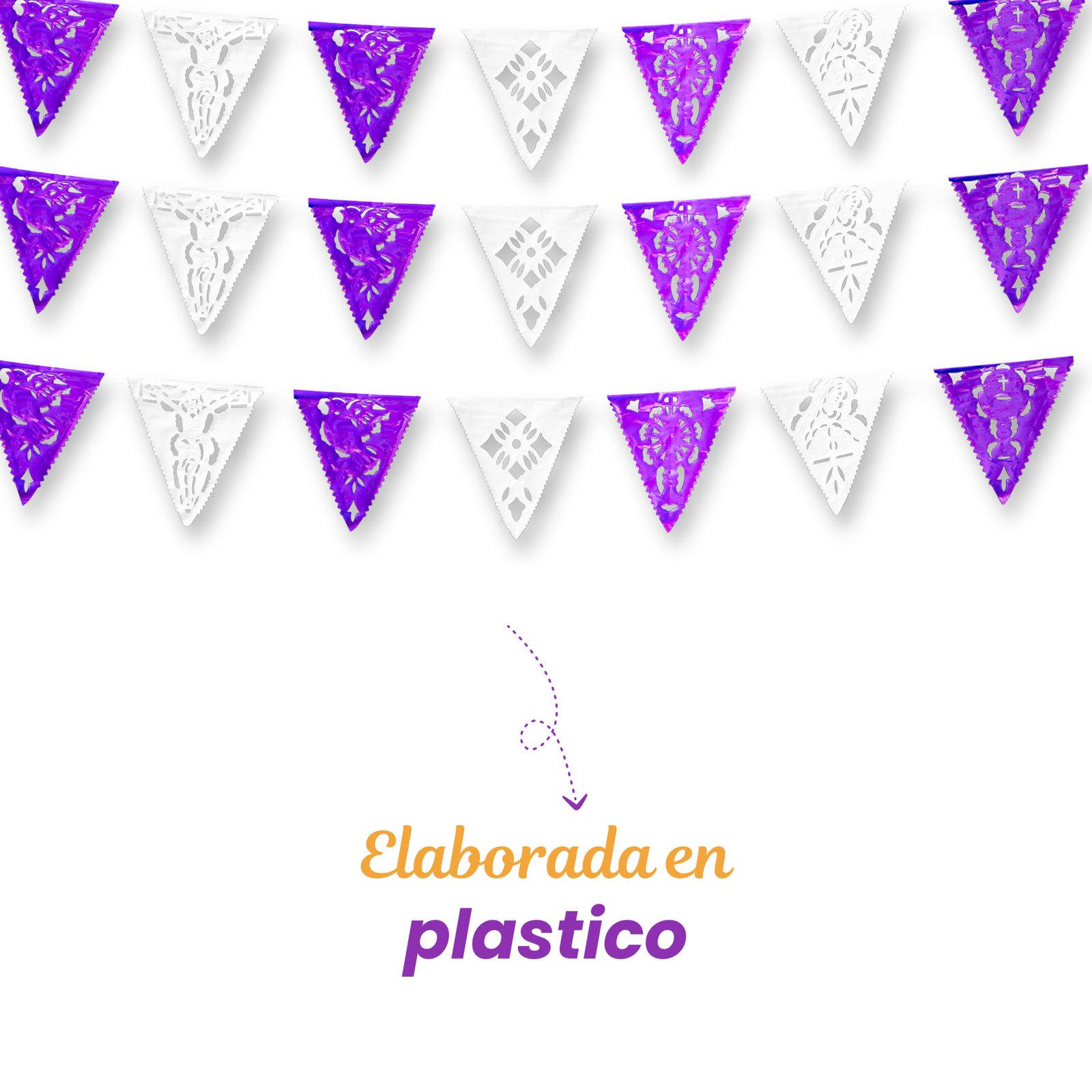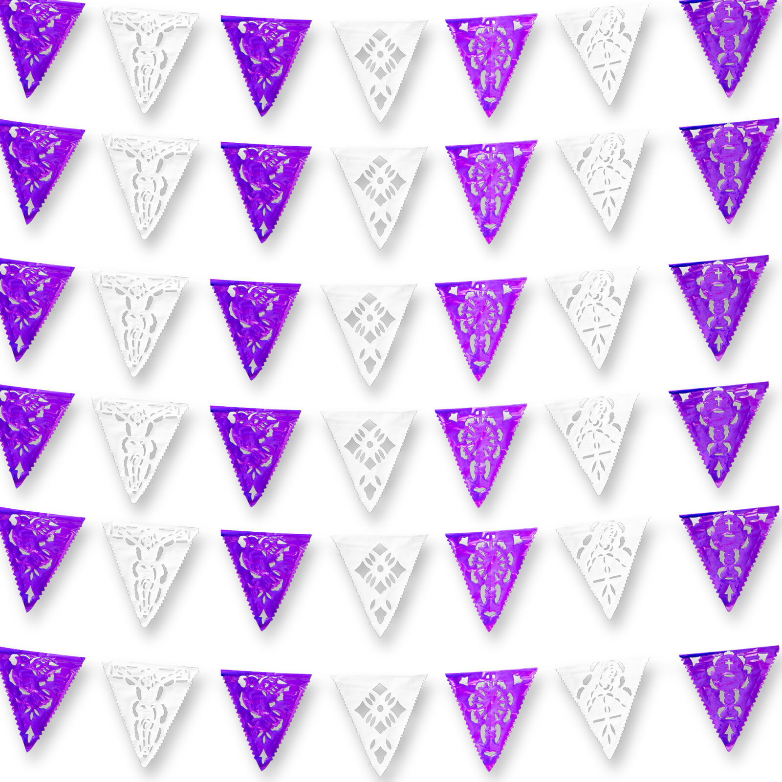 La Tira de Banderín Blanco–Morado es una opción decorativa diseñada para ambientaciones de Semana Santa, ideal para cubrir espacios amplios con una combinación tradicional de color y diseño religioso. Elaborada en plástico, esta tira integra banderines triangulares en combinación morado y blanco con detalles calados de temática religiosa. Su material permite mayor resistencia en comparación con el papel, facilitando su manejo y montaje.