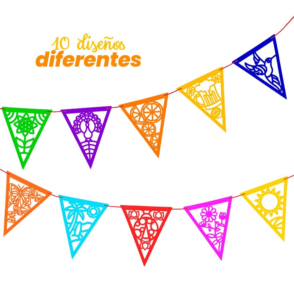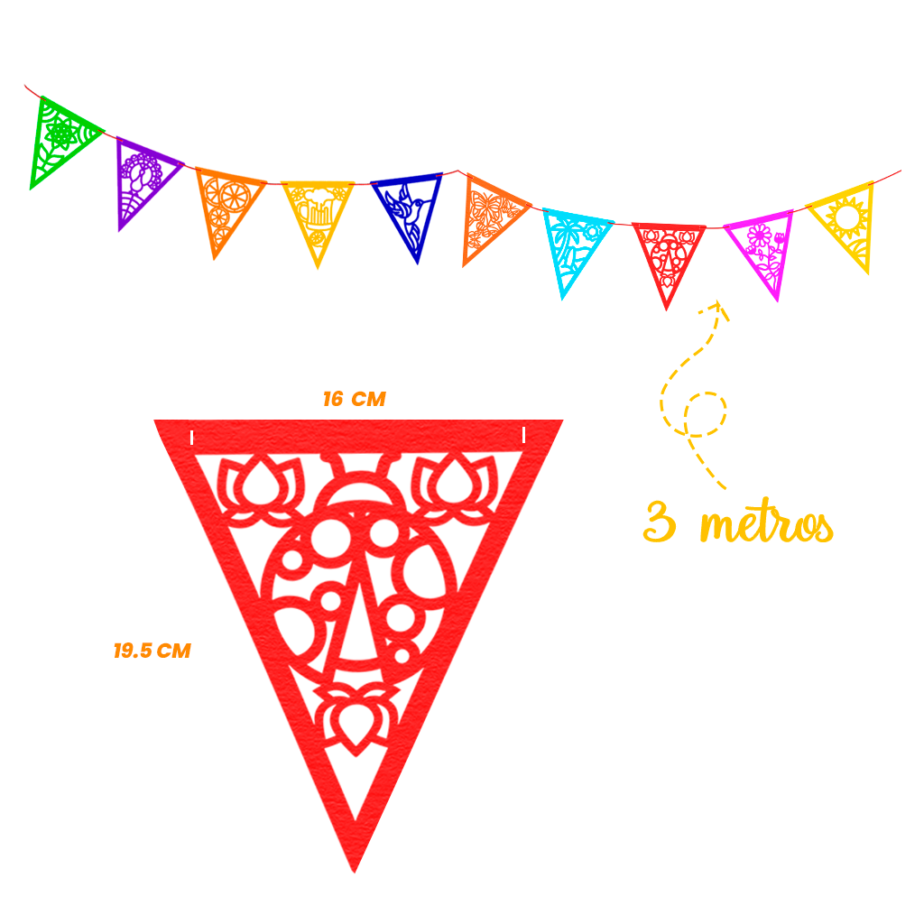 Fabricada en papel tipo cartulina, es ligera y fácil de colocar en salones, jardines techados, mesas de dulces, escaparates o eventos escolares. Su combinación multicolor permite integrarla en distintos montajes decorativos, aportando contraste y movimiento sin perder el estilo tradicional.