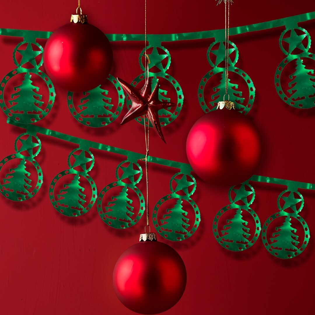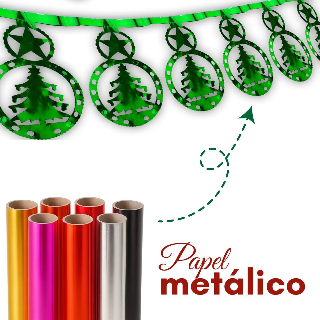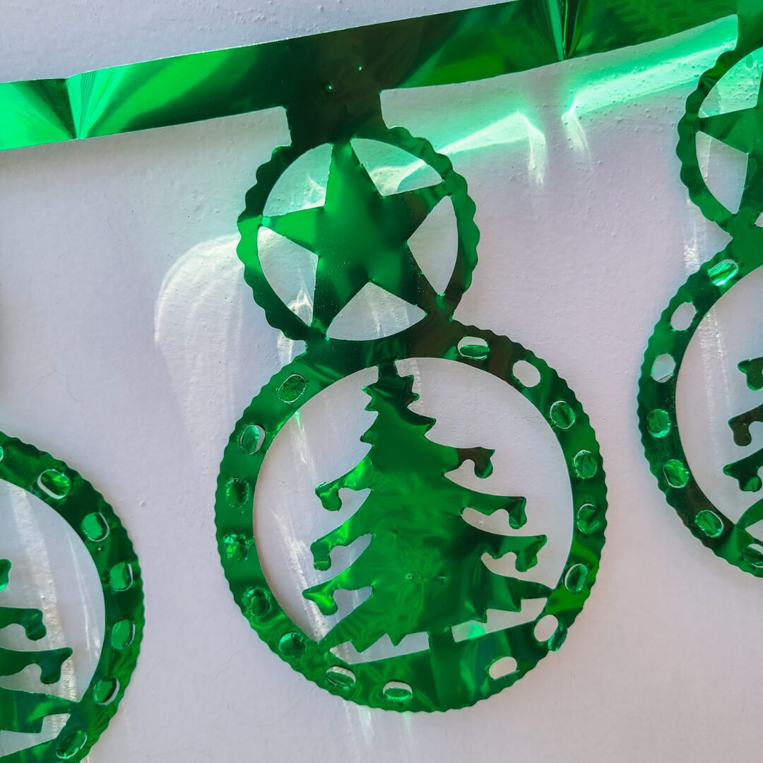 Tira metálica navideña elaborada en papel metálico brillante, con 12 figuras formadas por dos esferas unidas: una decorada con una estrella y la otra con un pino. Cada figura está calada de manera artesanal y luce muchísimo con la luz gracias al brillo del material. La tira mide aproximadamente 2 metros, es ligera, fácil de colocar y perfecta para decorar paredes, entradas, ventanas o cualquier espacio donde quieras agregar un detalle navideño vistoso y colorido. Disponible en colores variados sujetos a disponibilidad.