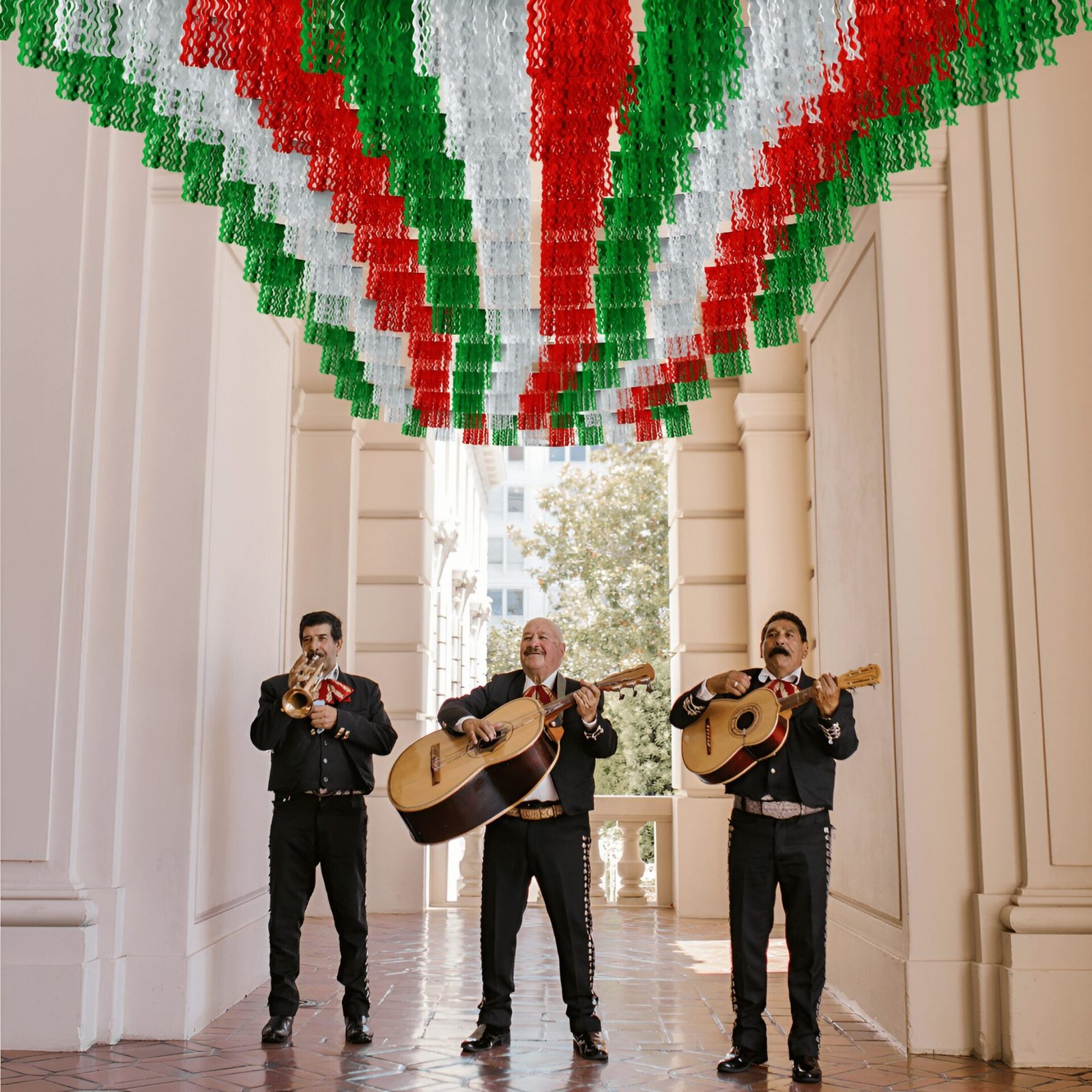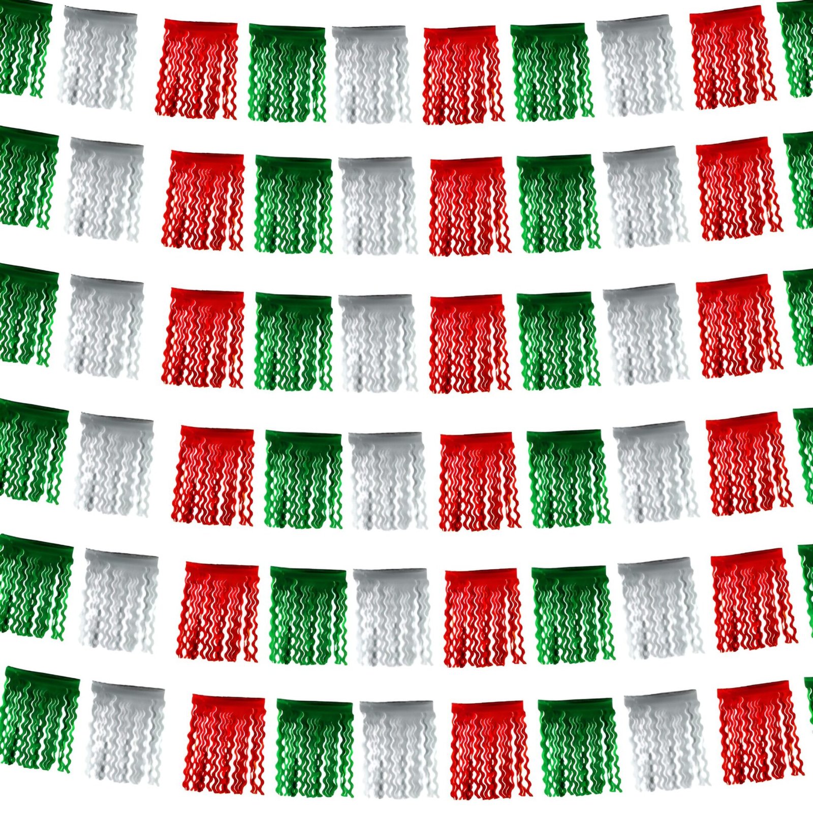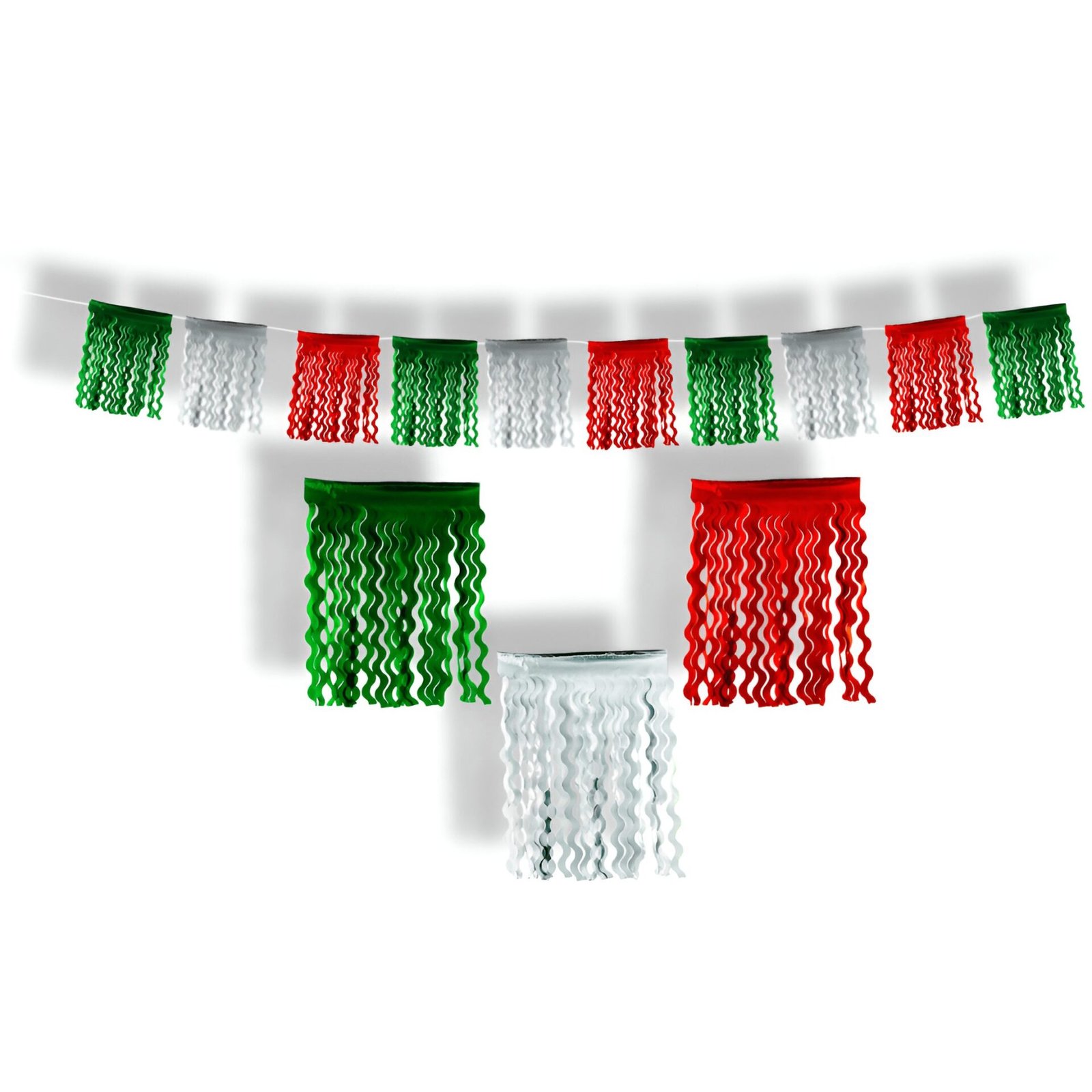 Tira decorativa elaborada con papel metálico en colores patrios: verde, blanco y rojo. Cada carpeta presenta cortes ondulados que crean un efecto dinámico y vistoso al colgarla. Su diseño llamativo y ligero la hace ideal para decorar entradas, techos, marcos o pasillos. Algunas personas la conocen como “tira hawaiana” por su forma y movimiento al colgar, perfecta para ambientar fiestas patrias o eventos con temática mexicana.